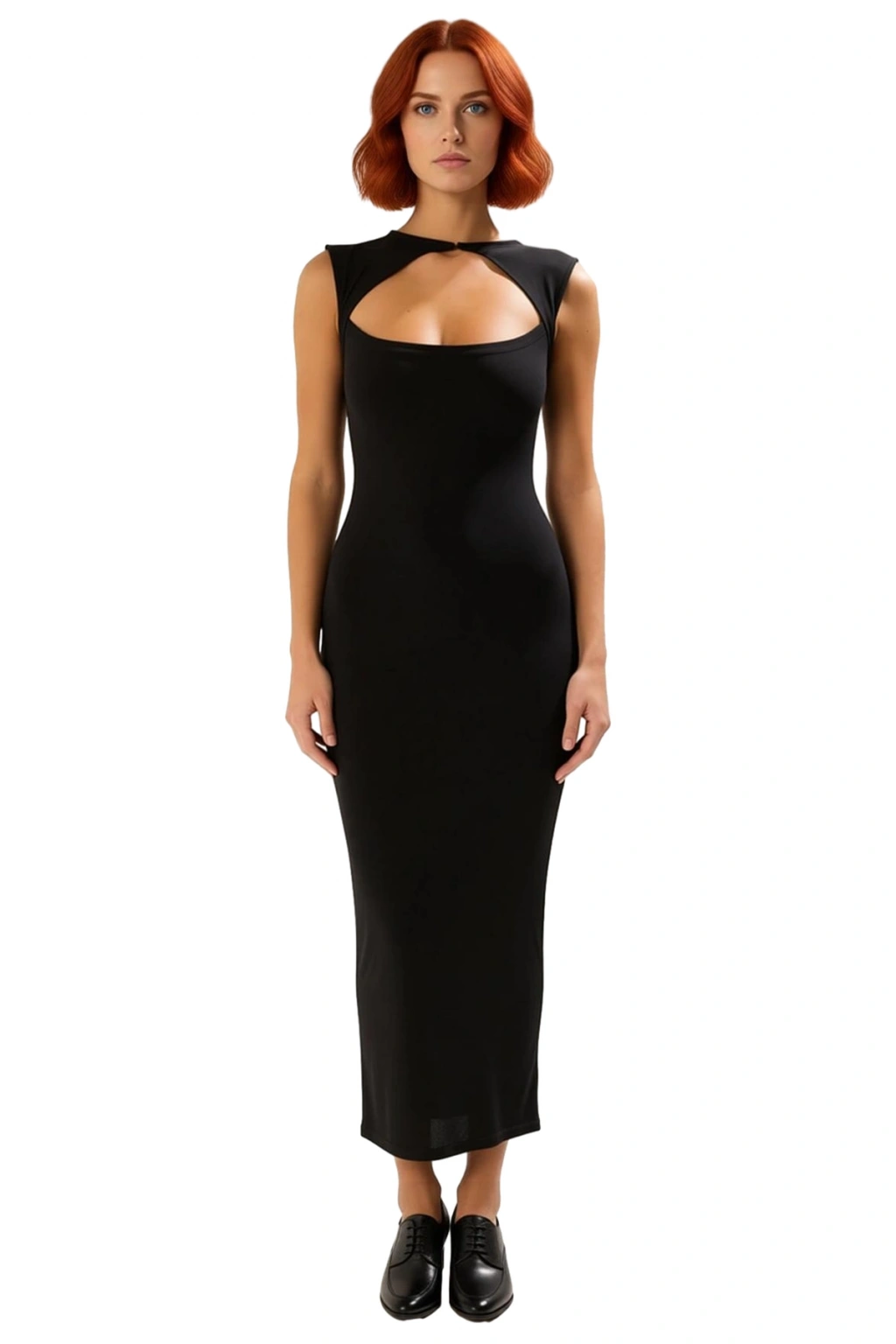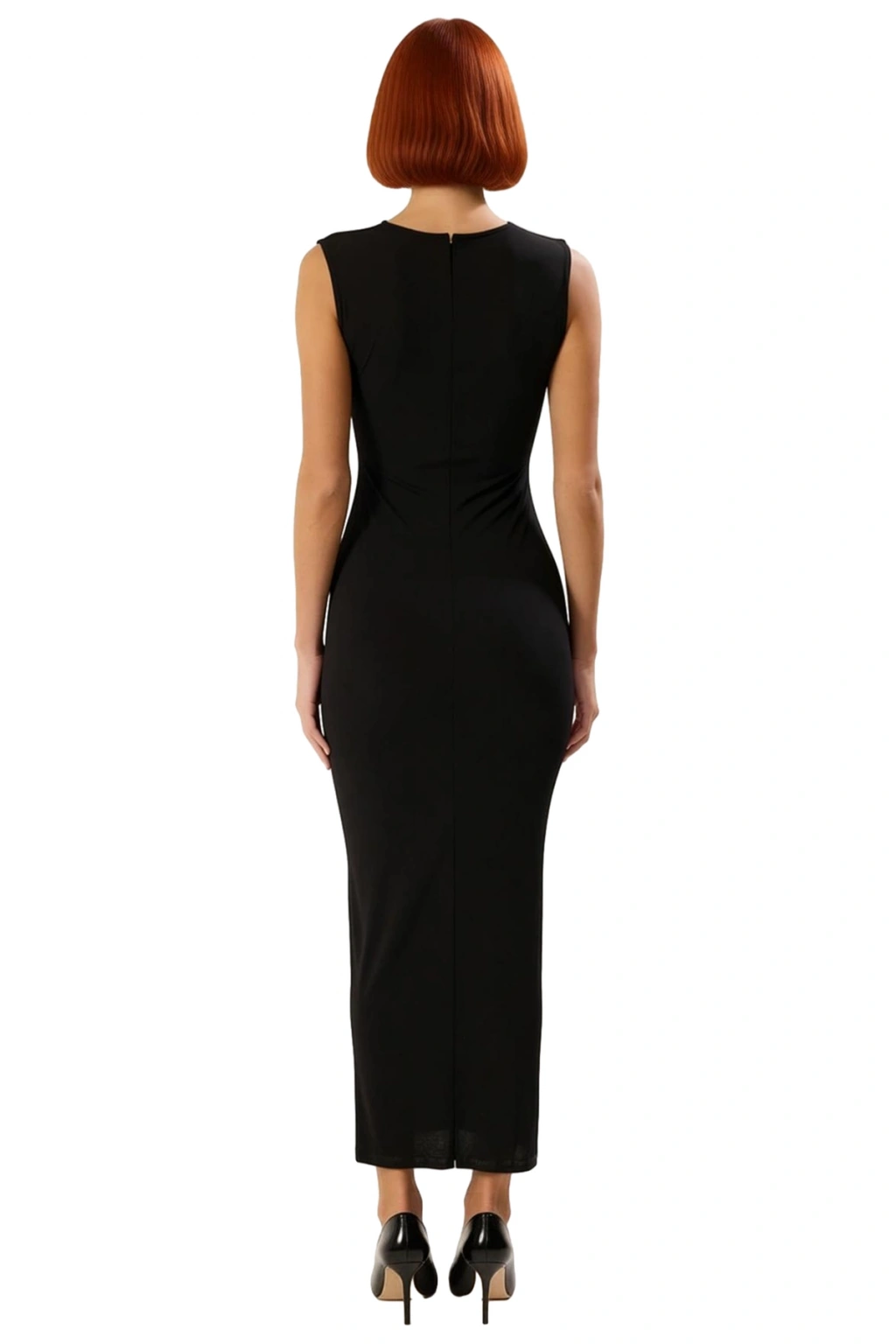 Ürün Özellikleri: Bodycon kalıp, polyester materyal, düz desen, bisiklet yaka (cut out detaylı), kolsuz, örme sandy kumaş, siyah renk.