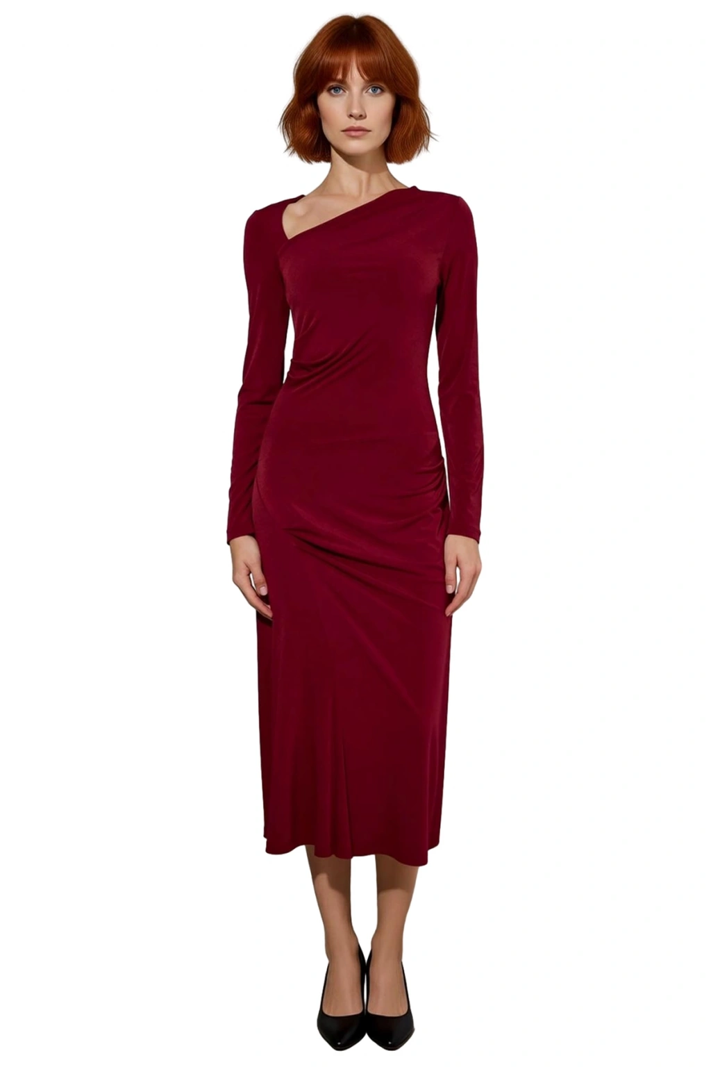 Ürün Özellikleri: Bodycon kalıp, polyester elastan materyal, düz desen, asimetrik yaka, standart kol, örme kumaş, bordo renk, astarlı.