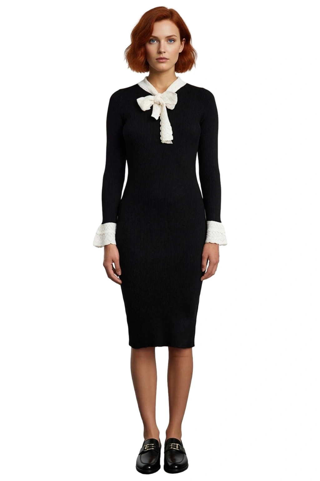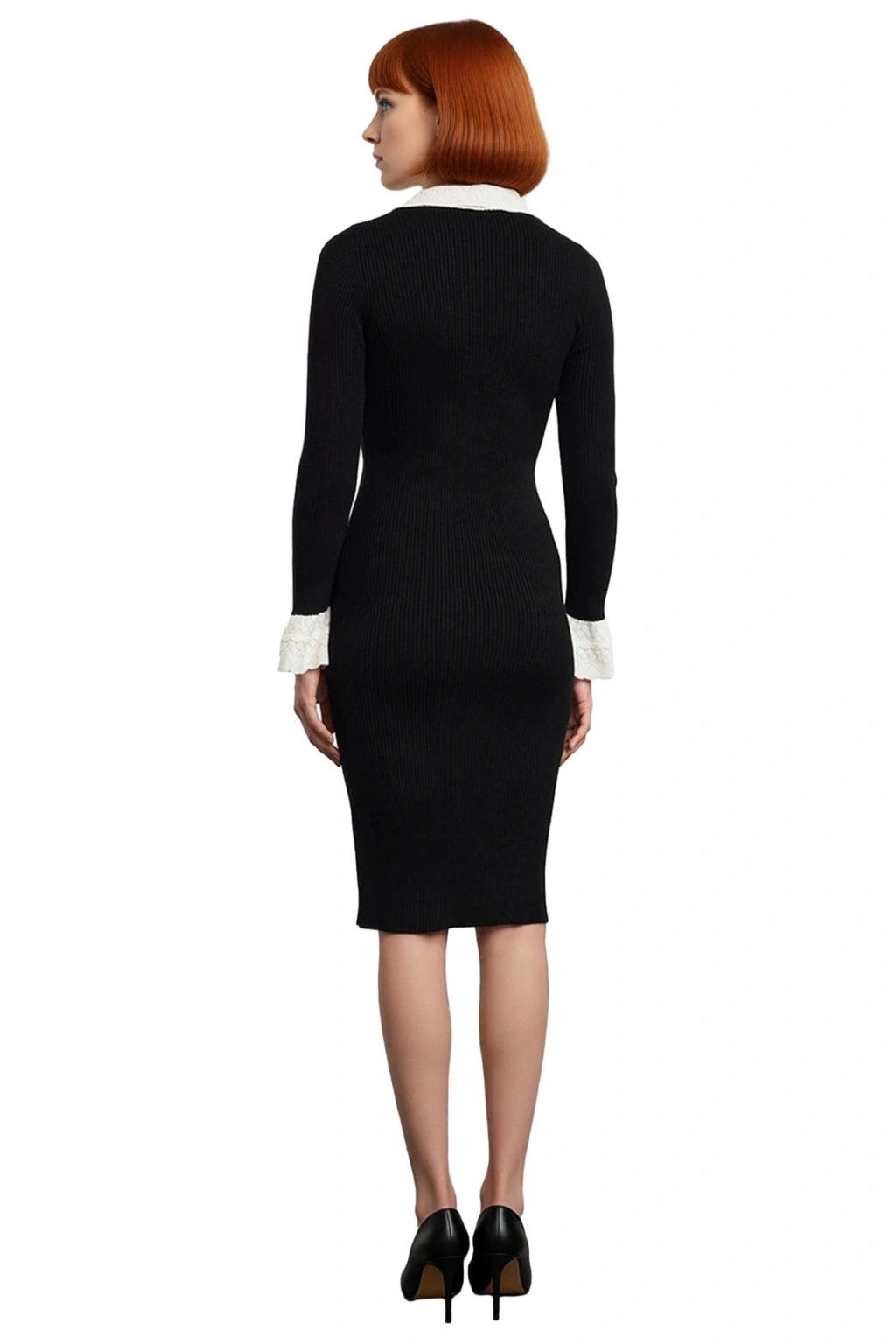 Ürün Özellikleri: Bodycon kalıp, %100 akrilik materyal, renk bloklu desen, bebe yaka, standart kol, triko kumaş, siyah renk.