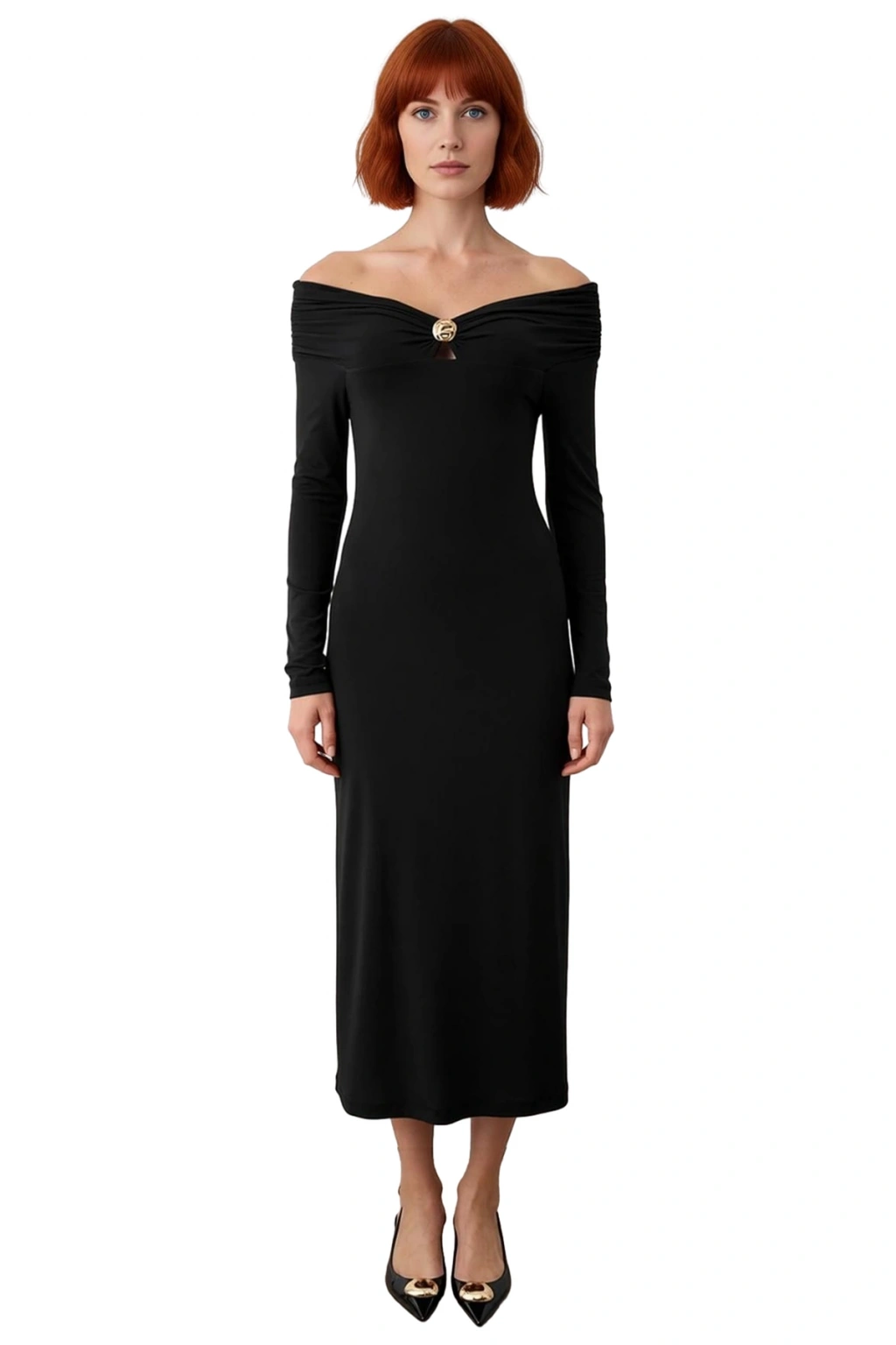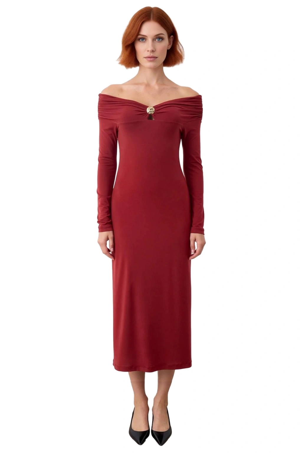 Ürün Özellikleri: Bodycon kalıp, polyester elastan karışımı materyal, düz desen, carmen yaka, düşük kol, örme kumaş, kiremit renk, aksesuar detaylı.