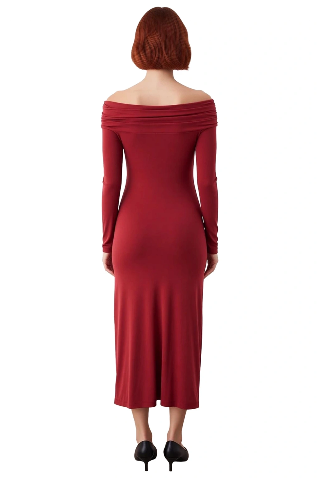 Bu dikkat çekici kadın elbisesi, bodycon kesimi ile vücudunuzu zarifçe sararak modern ve iddialı bir silüet oluşturur. Carmen yaka tasarımıyla omuzlarınızı nazikçe açıkta bırakırken, altın rengi aksesuar detayı elbiseye sofistike bir ışıltı katar. Düz deseni, kiremit renginin derinliğiyle birleşerek sade ama etkileyici bir görünüm sunar. Yüksek kaliteli örme kumaşı ve polyester elastan karışımı materyali sayesinde hem esnek hem de konforlu bir kullanım vadeder. Kış modasının vazgeçilmez parçalarından biri olmaya adaydır.