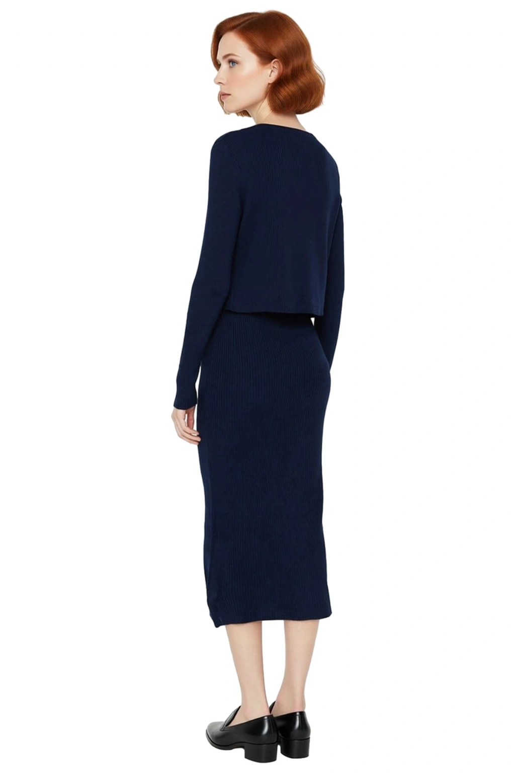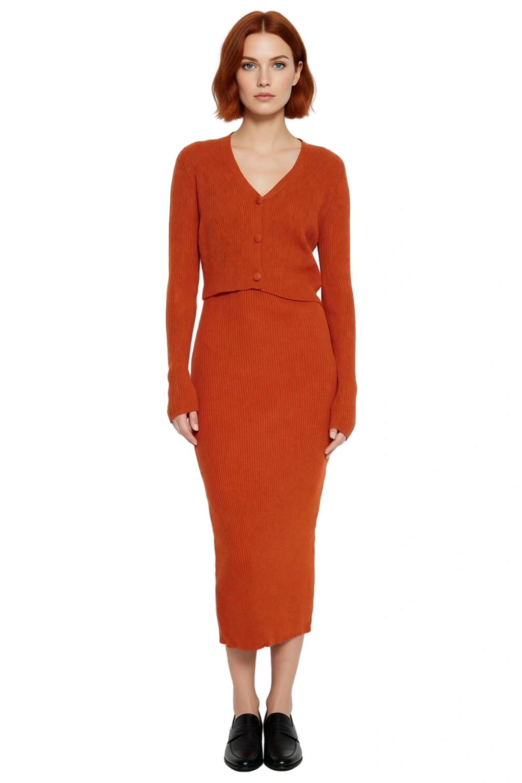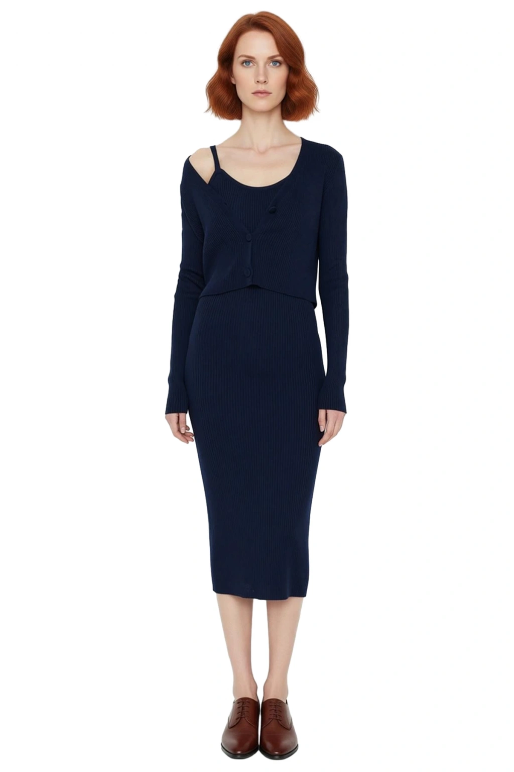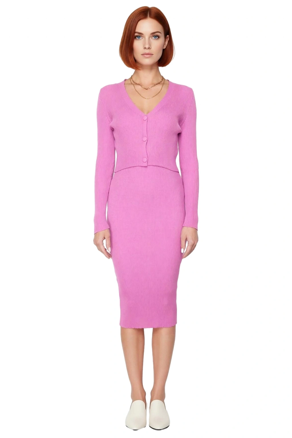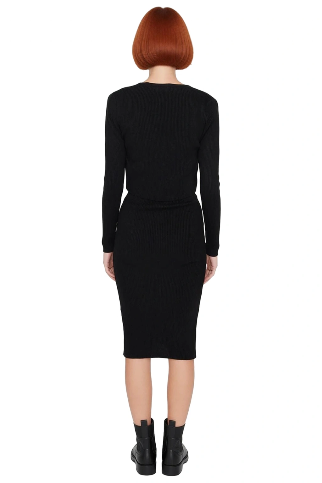 V yaka tasarımı boynu zarifçe vurgularken, uzun ve standart kol yapısı soğuk havalarda bile sıcak tutar. Midi boyu ile hem klasik hem de modern bir duruş sergiler. Triko kumaşının esnek yapısı, gün boyu hareket özgürlüğü sunarken, orta kalınlığı sayesinde rahatlık ve şıklığı bir arada yaşatır. Düğmeli detayı, elbiseye hareket katarken kolay giyim imkanı sunar. Cepsiz oluşu, elbisenin akıcı siluetini korur. Bakımı oldukça pratik olup, makinede yıkamaya uygundur ve uzun ömürlü kullanım vaat eder.