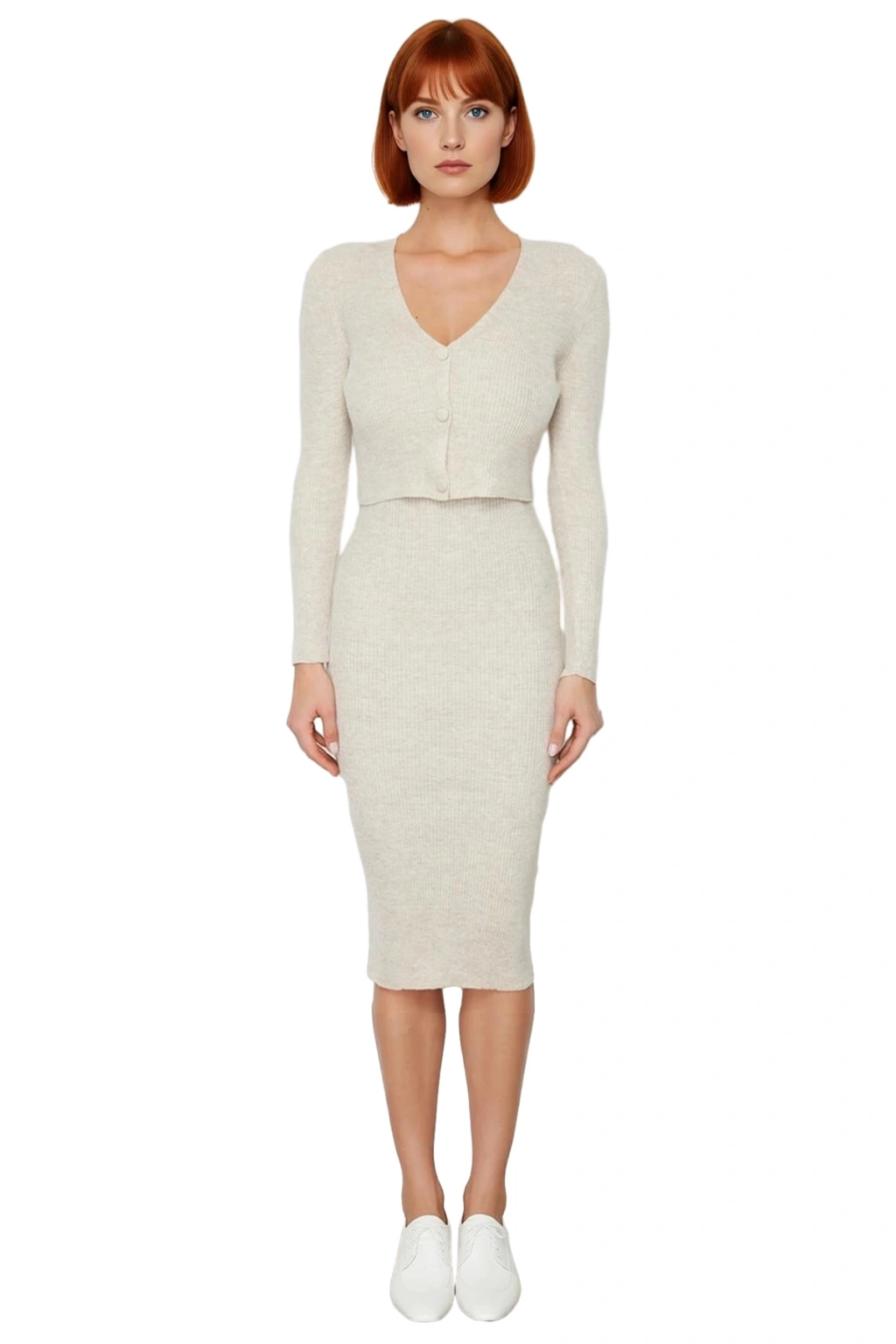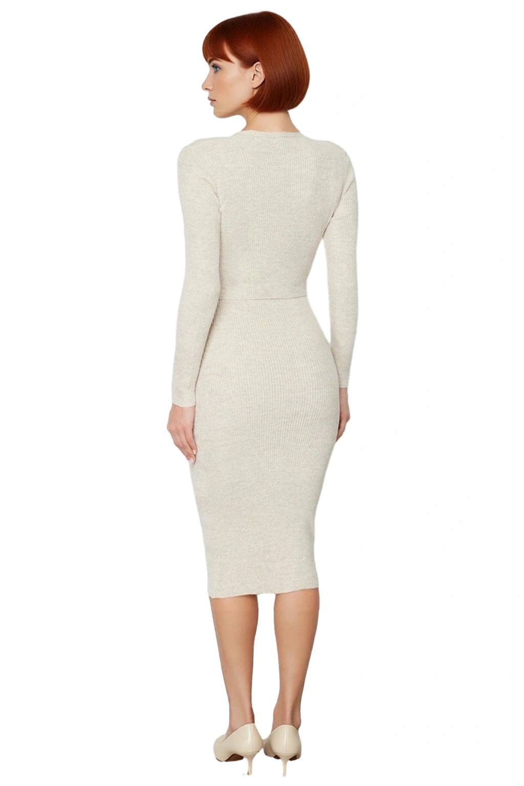Ürün Özellikleri: Bodycon kalıp, akrilik materyal, düz desen, v yaka, standart kol, triko kumaş, bej renk, baskısız tasarım.