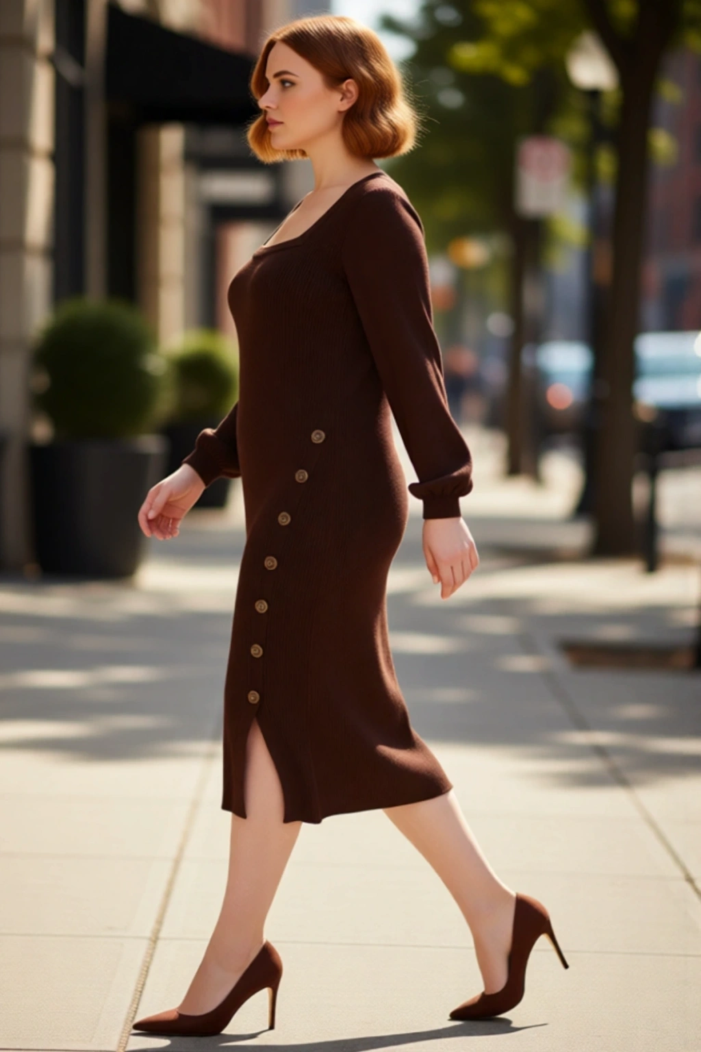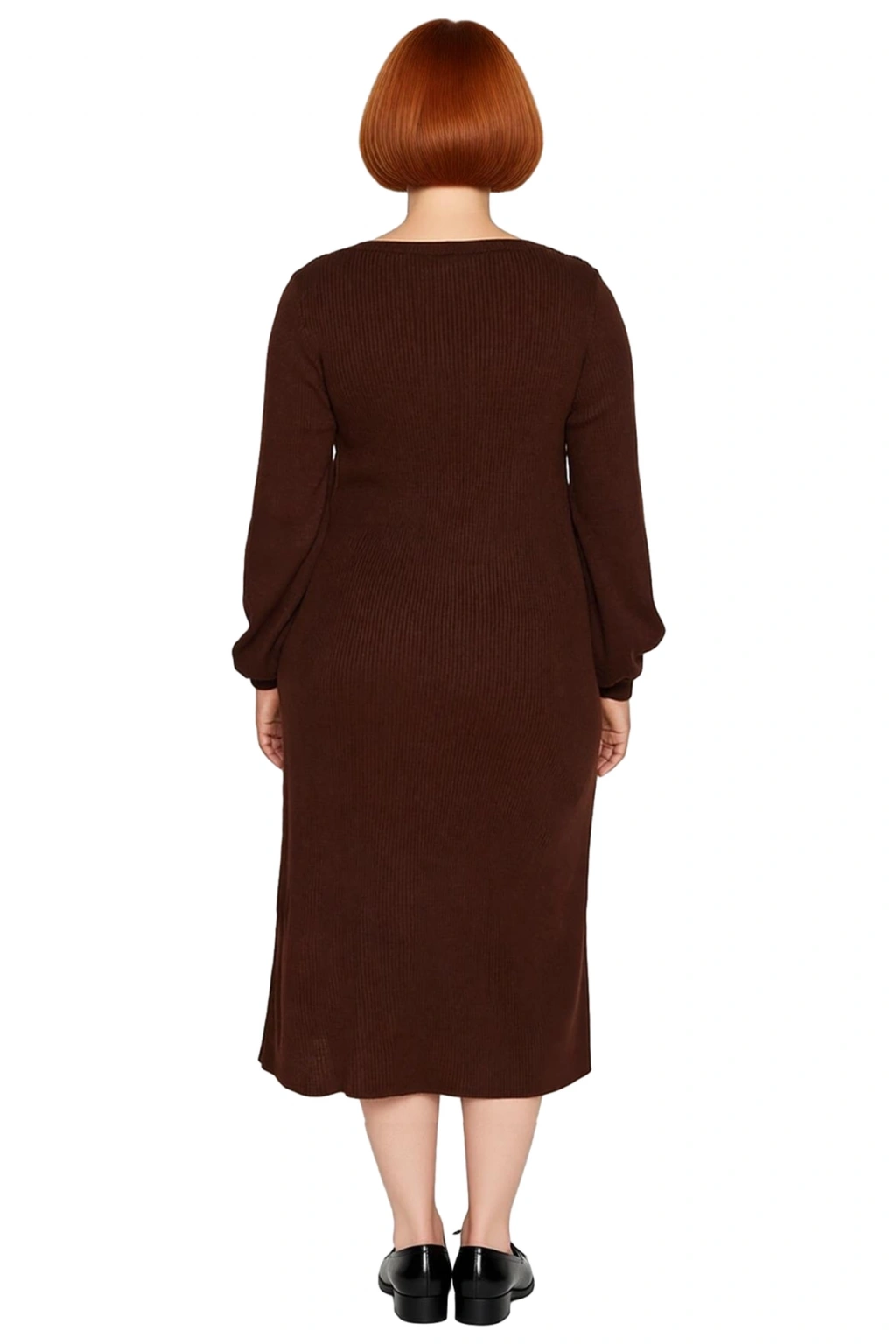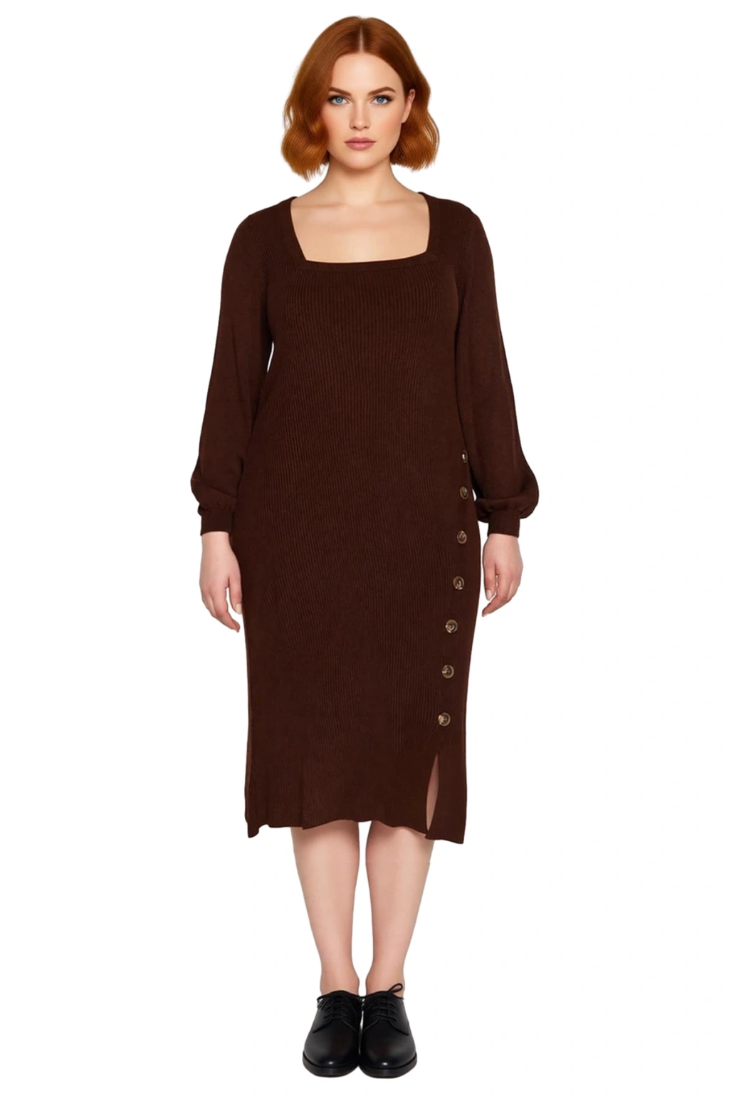 Ürün Özellikleri: Bodycon kalıp, 100% akrilik materyal, düz desen, kare yaka, standart kol, triko kumaş, kahverengi renk, düğme detaylı, yırtmaçlı.
