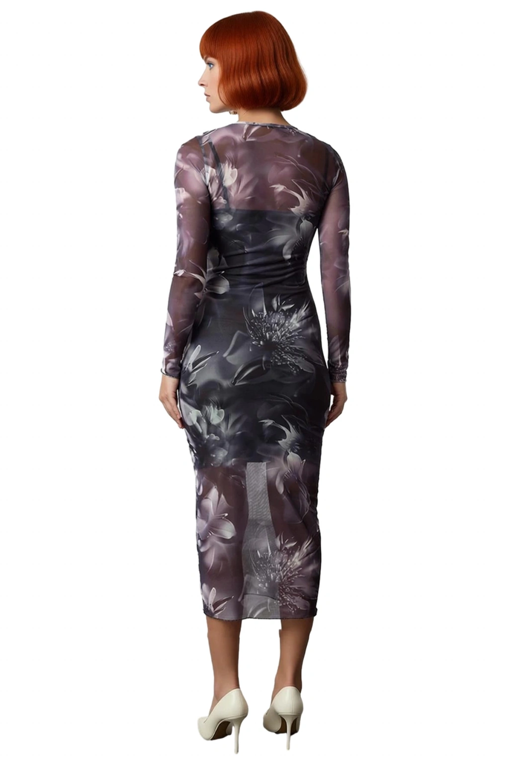 Ürün Özellikleri: Bodycon kalıp, polyester karışımlı materyal, desenli, bisiklet yaka, standart kol, örme kumaş, gri renk, astarlı tasarım.