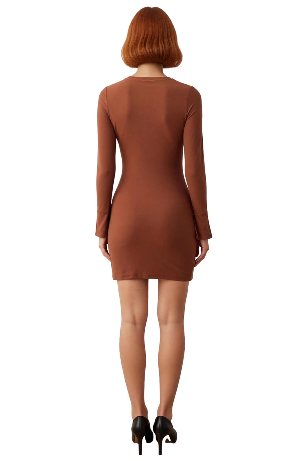 Ürün Özellikleri: Bodycon kalıp, 92% Polyester 8% Elastan materyal, düz desen, bisiklet yaka, standart kol, mikro likralı interlok kumaş, koyu kahverengi renk, büzgü drape detaylı, astarsız.