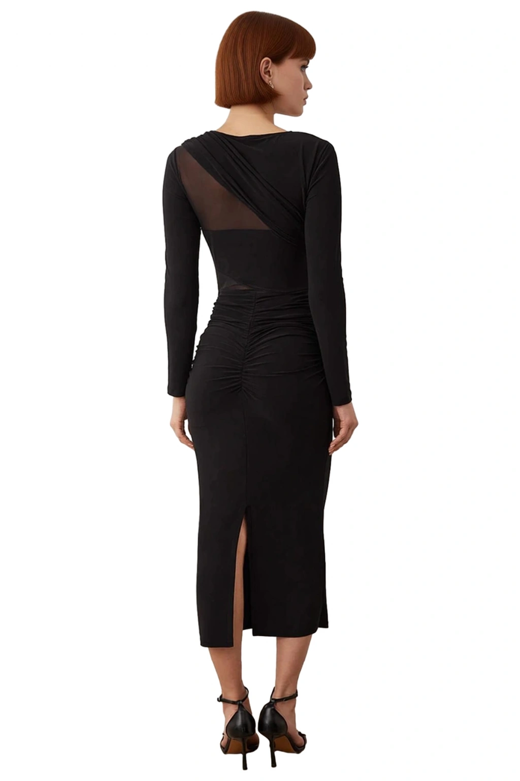 Bisiklet yaka tasarımı, boyun bölgesine klasik ve sofistike bir dokunuş katarken, uzun ve standart kolları soğuk havalarda sıcaklık ve şıklık sunar. Örme kumaş tipi ve sandy dokuması, elbisenin dökümlü ve akışkan bir yapıya sahip olmasını sağlar. Astarlı yapısı sayesinde iç göstermez ve ekstra konfor sunar. Vücuda oturan ruched (büzgülü) detayları, figürü şekillendirerek daha estetik bir görünüm yaratır. Makinede yıkanabilir özelliği ile bakımı oldukça kolaydır, uzun ömürlü kullanım vaat eder.