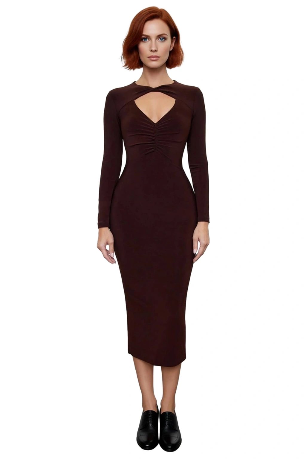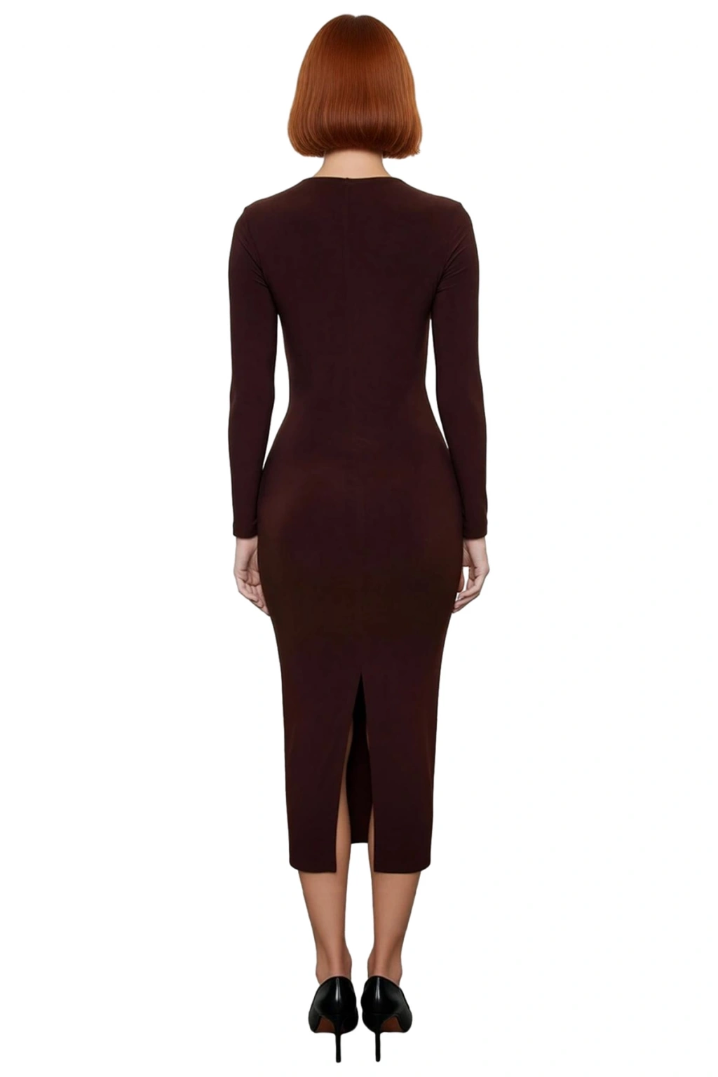 Ürün Özellikleri: Bodycone kalıp, polyester karışımlı materyal, düz desen, choker yaka, uzun kol, sandy kumaş, kahverengi renk.