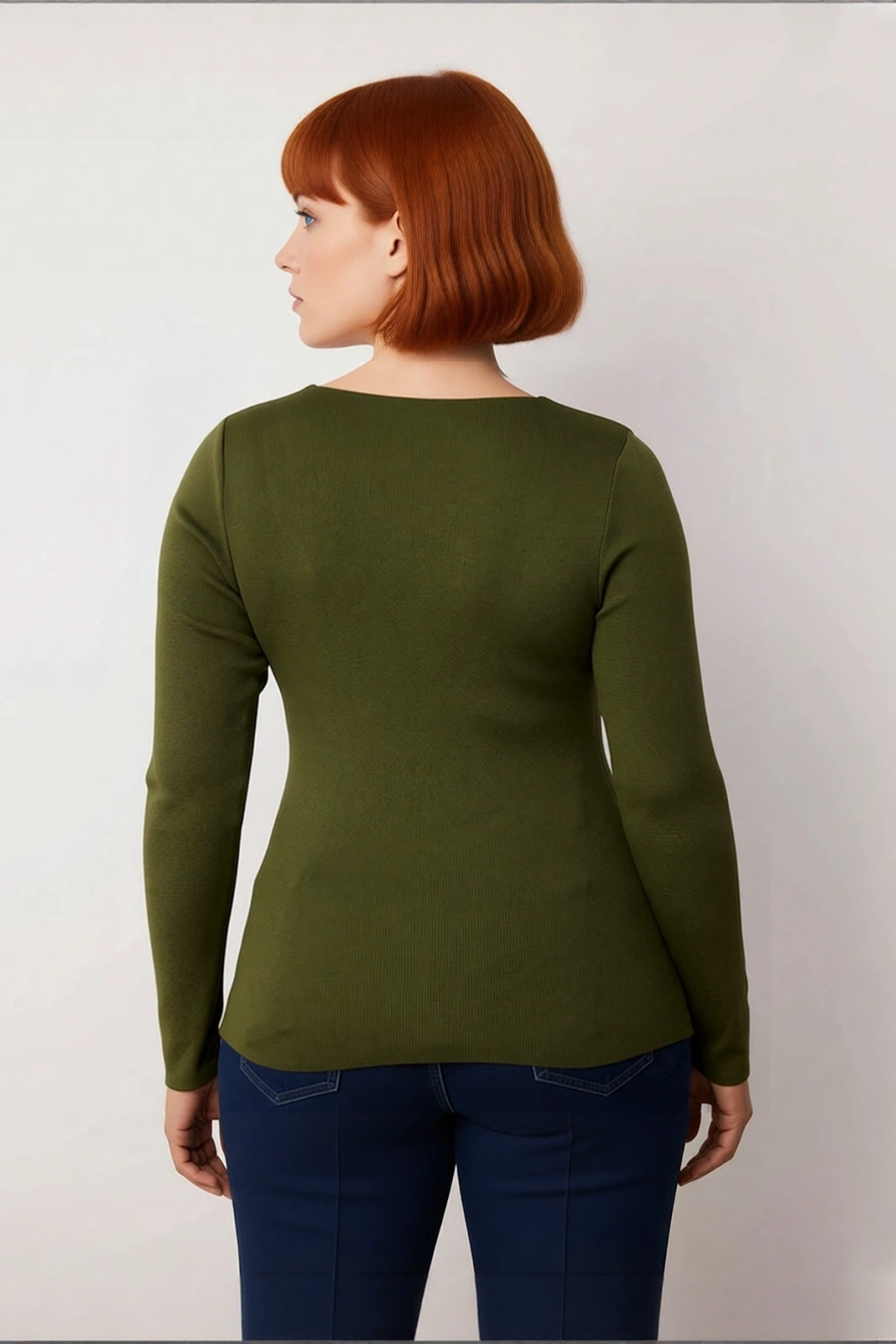 Ürün Özellikleri: Fitted kalıp, polyester materyal, düz desen, V yaka, standart kol, triko kumaş, haki renk.