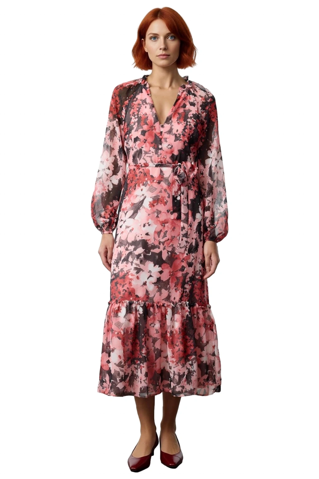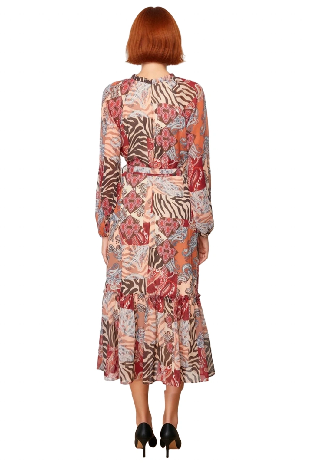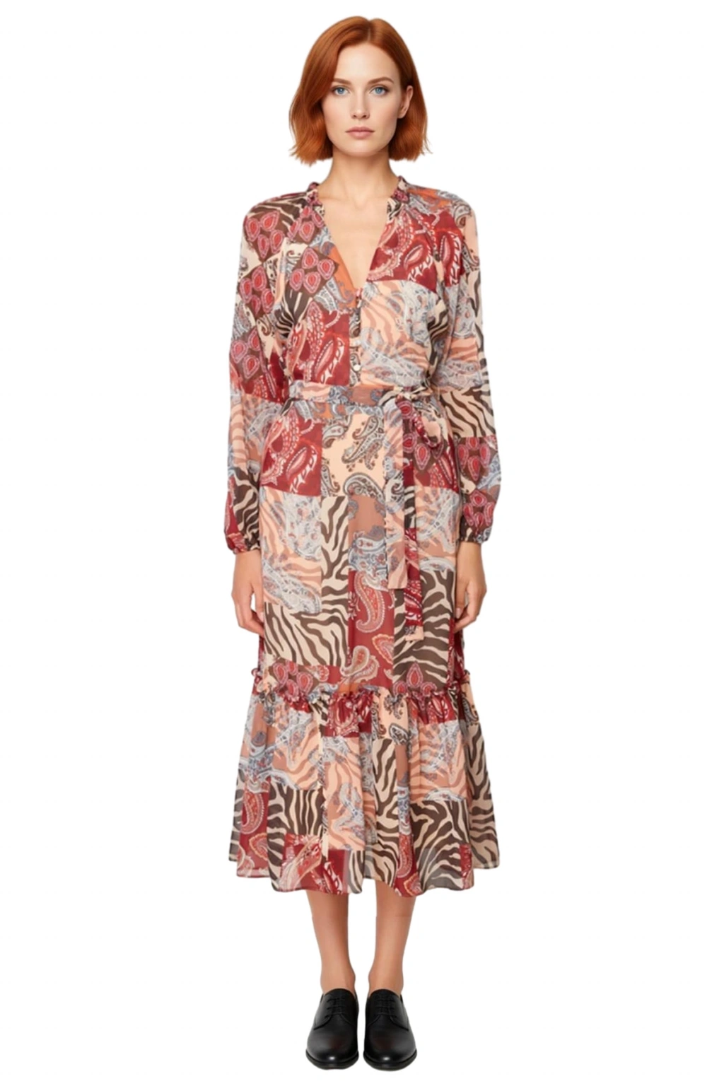 Ürün Özellikleri: A-line kalıp, polyester materyal, şal desen, V yaka, uzun standart kol, şifon dokuma kumaş, çok renkli.