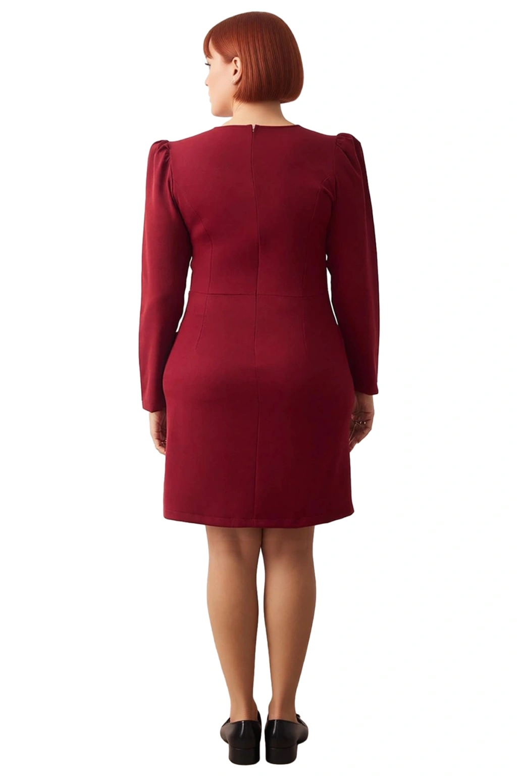 Ürün Özellikleri: Bodycon kalıp, polyester materyal, düz desen, V yaka, standart kol, dokuma kumaş, bordo renk, kısa/mini boy.