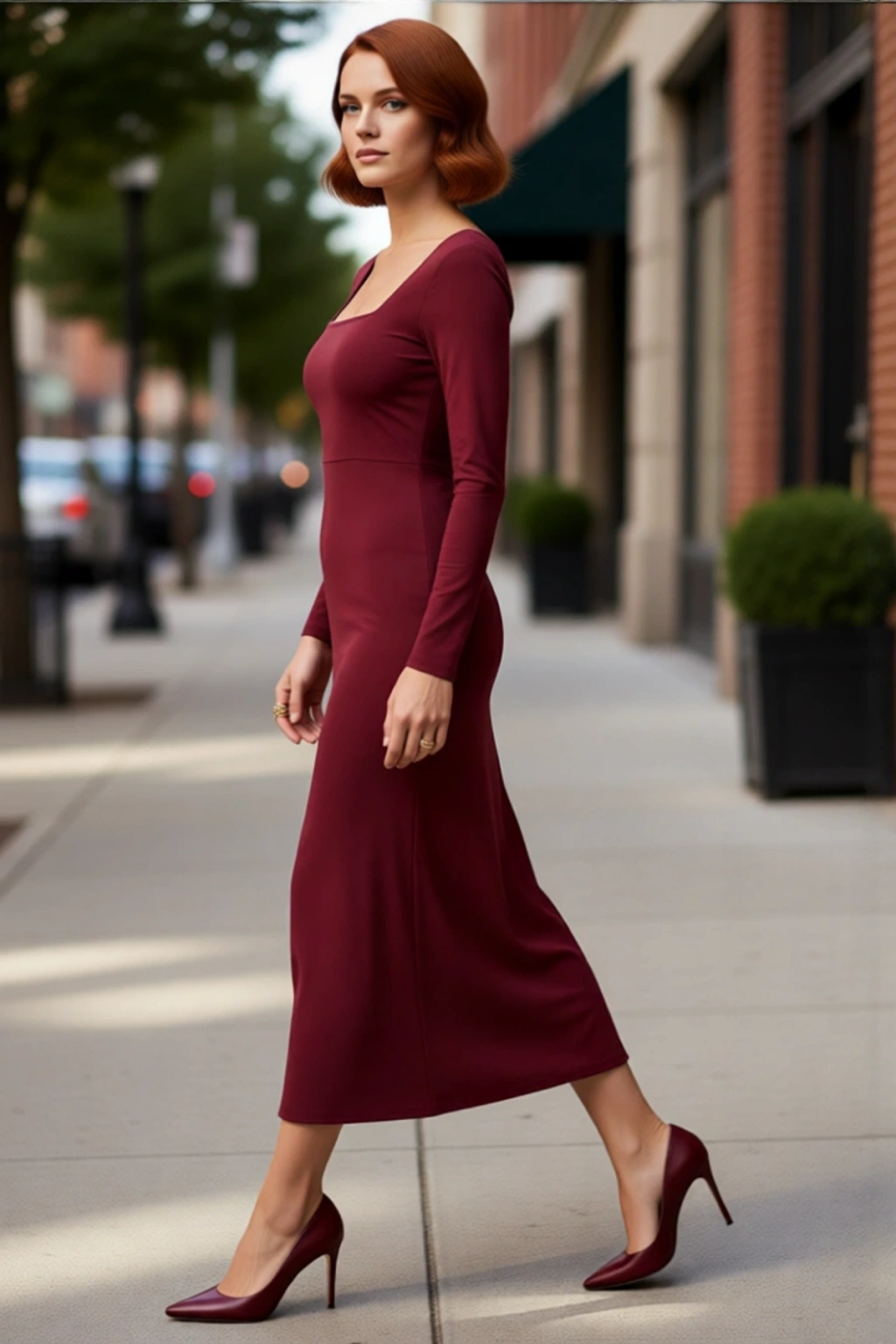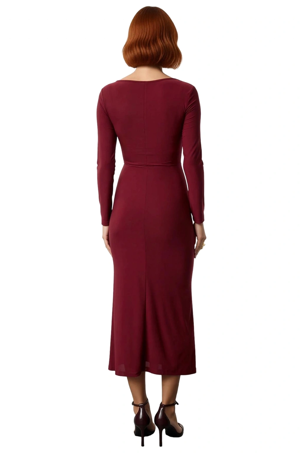 Ürün Özellikleri: Bodycon kalıp, polyester karışımlı materyal, düz desen, kare yaka, standart uzun kol, örme kumaş, bordo renk, baskısız tasarım.