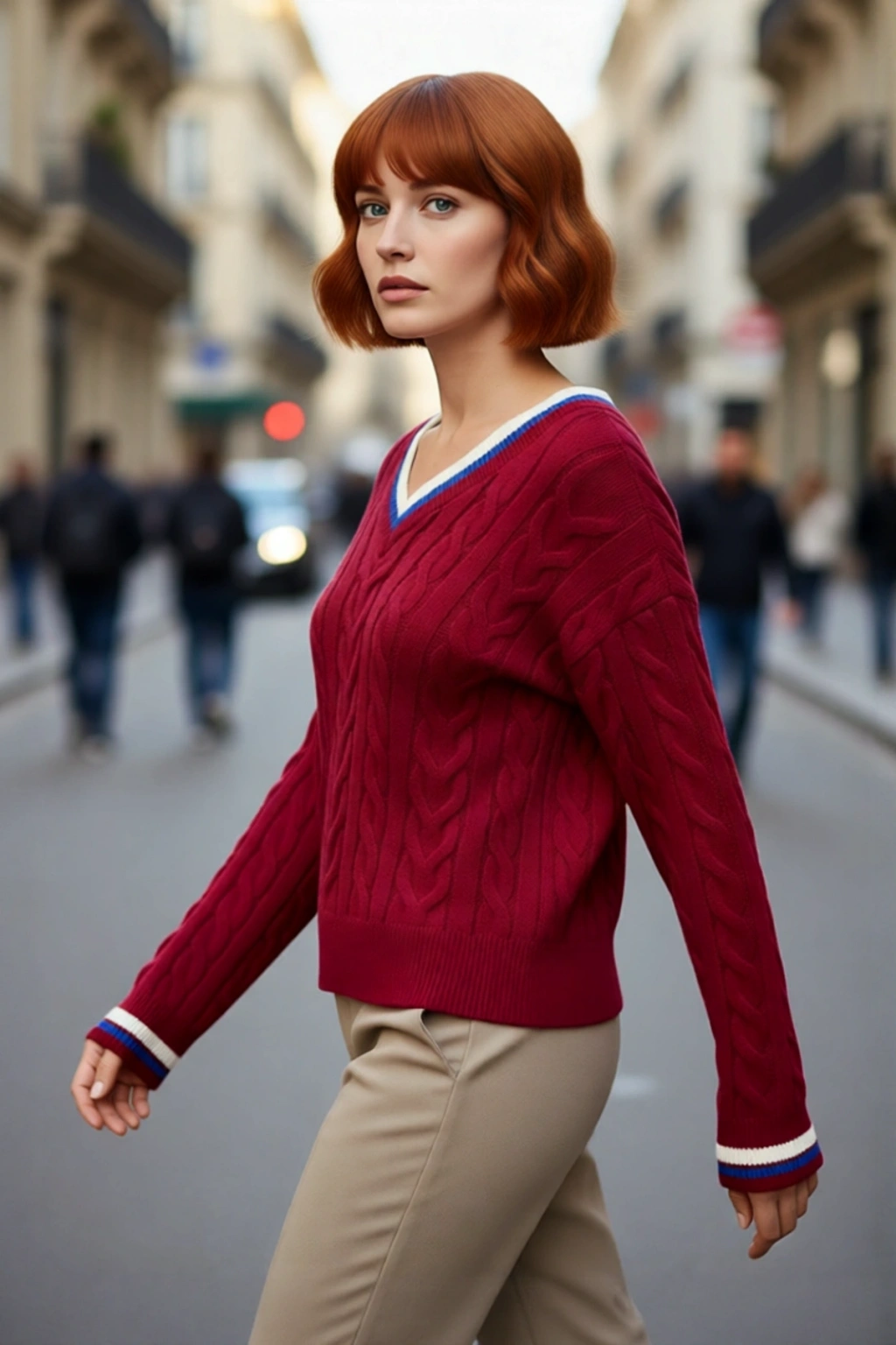 Bordo rengin asaletini taşıyan bu kadın triko kazak, regular kalıbıyla vücuda nazikçe oturur ve gün boyu süren bir rahatlık hissi sunar. %100 akrilik materyalden özenle üretilen bu ürün, cilt dostu yapısıyla konfor sağlarken, saç örgü deseniyle geleneksel triko estetiğini modern bir çizgiye taşır. V yaka ve düşük kol tasarımı ile spor şıklığı yakalayan bu kazak, özellikle ilkbahar ve sonbahar mevsimlerinin geçiş dönemleri için idealdir. Casual ve günlük kombinlerinize kolayca adapte olarak stilinize dinamik bir dokunuş katar.