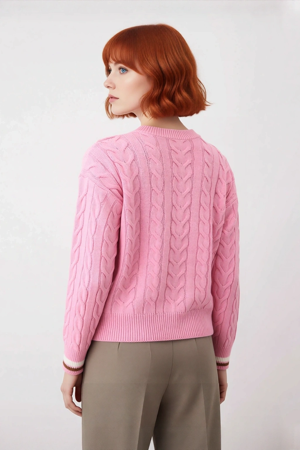 Ürün Özellikleri: Regular kalıp, %100 akrilik materyal, saç örgü desen, V yaka, düşük kol, triko kumaş, bordo renk, baskısız tasarım.