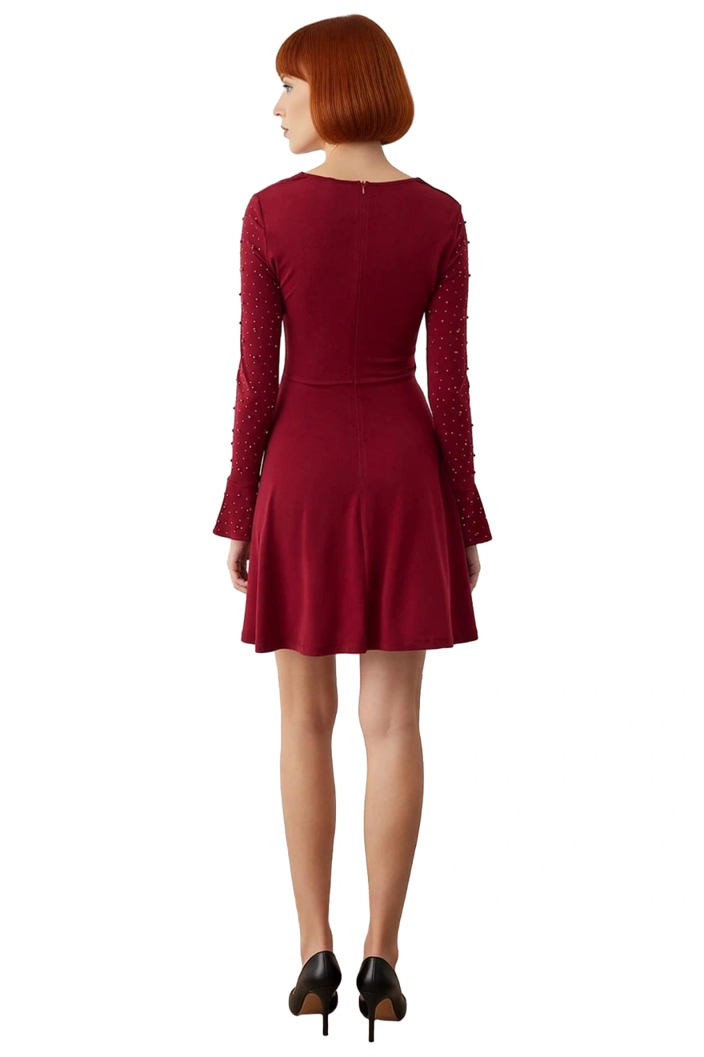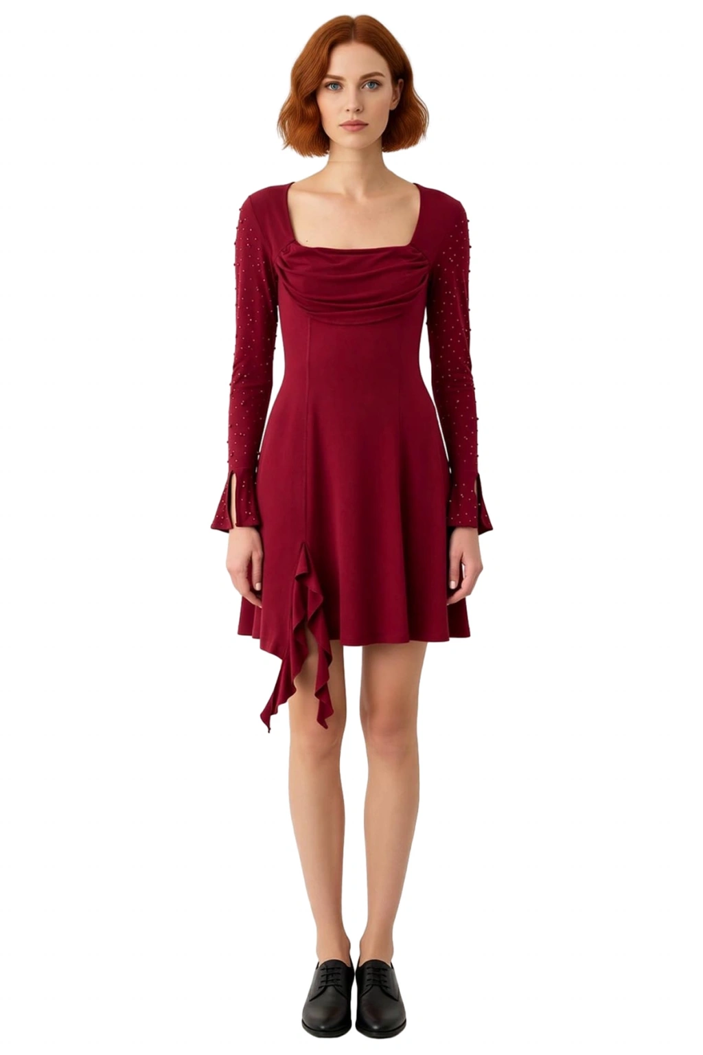 Ürün Özellikleri: Skater kalıp, polyester materyal, düz desen, kare yaka, standart kol, örme kumaş, bordo renk, taş aksesuar.