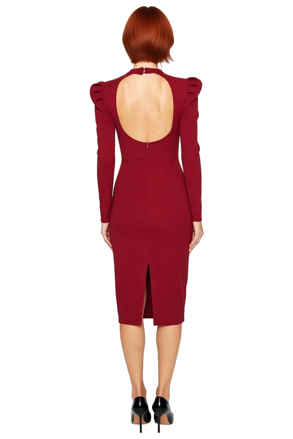 Ürün Özellikleri: Bodycon kalıp, dokuma materyal, düz desen, kalp yaka, uzun balon kol, Finike dokuma kumaş, bordo renk, baskısız tasarım.