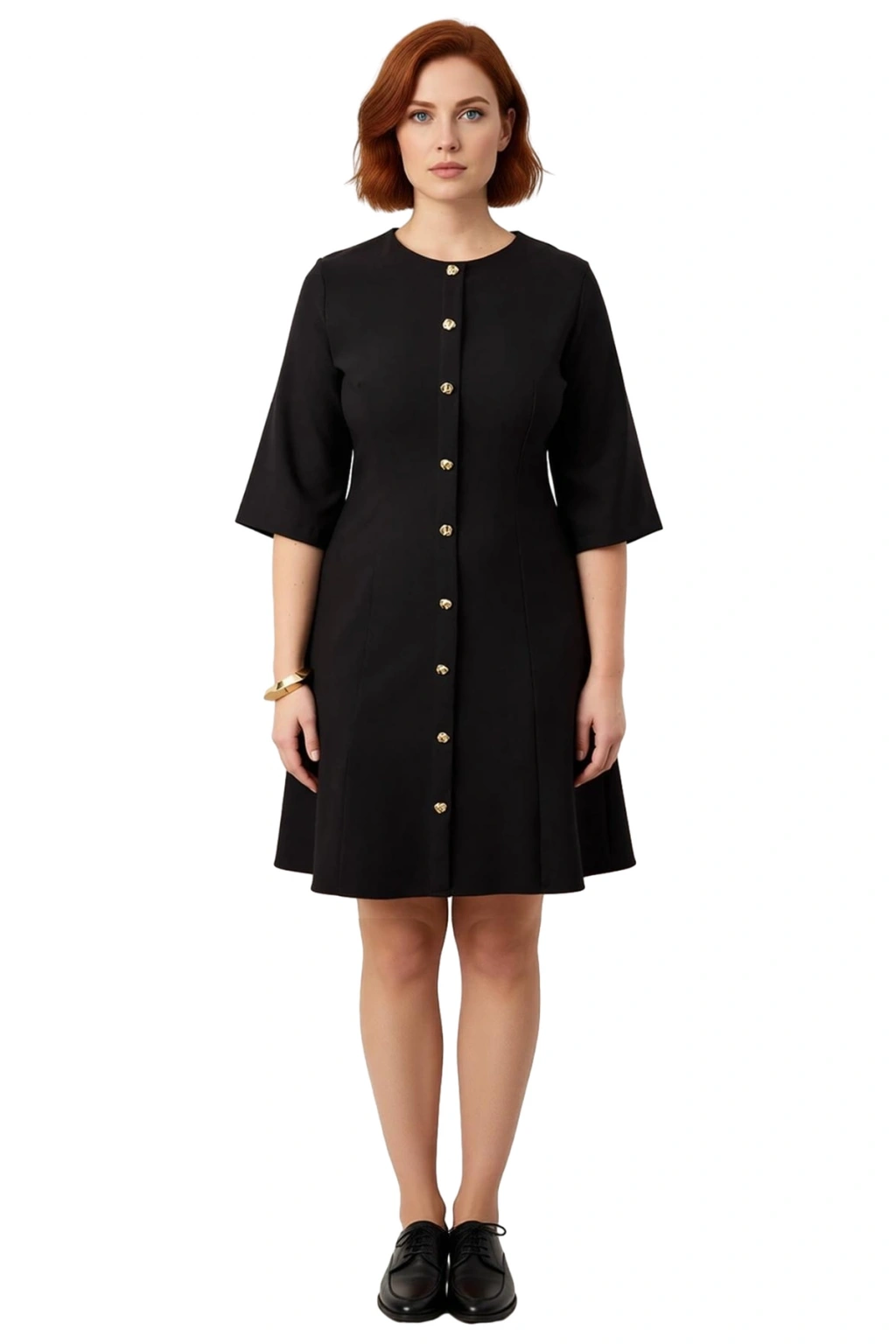 Modern Kadın A-line dokuma elbise, büyük beden kadınlar için özel olarak tasarlanmış zarif kesimiyle vücuda mükemmel bir uyum sağlar. Yüksek kaliteli Finike dokuma kumaşı, 87% polyester ve 13% elastan karışımı sayesinde gün boyu süren konfor ve esneklik sunar. Düz deseni sade ve şık bir görünüm yaratırken, elbisenin ön kısmını süsleyen altın rengi dekoratif düğmeler tasarıma zengin bir hava katar. Siyah rengi, her gardırobun temel parçası olup, her türlü aksesuarla kolayca kombinlenebilir.