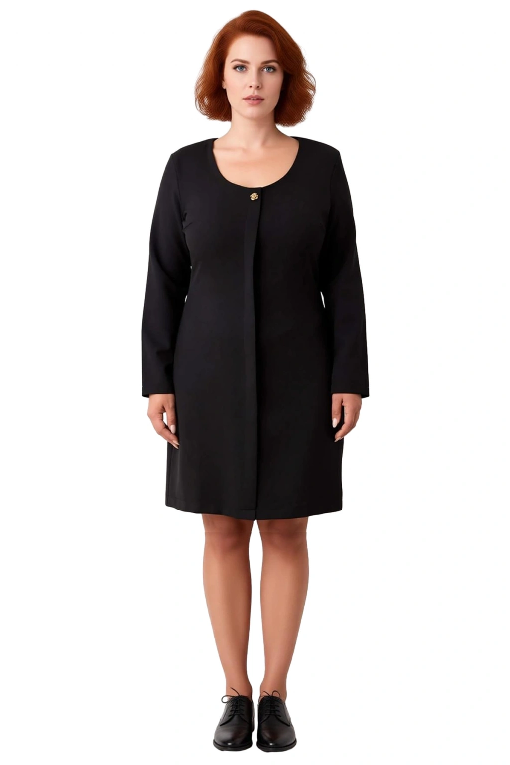Ürün Özellikleri: A-line kalıp, %87 polyester %13 elastan materyal, düz desen, havuz yaka, standart kol, dokuma kumaş, siyah renk.