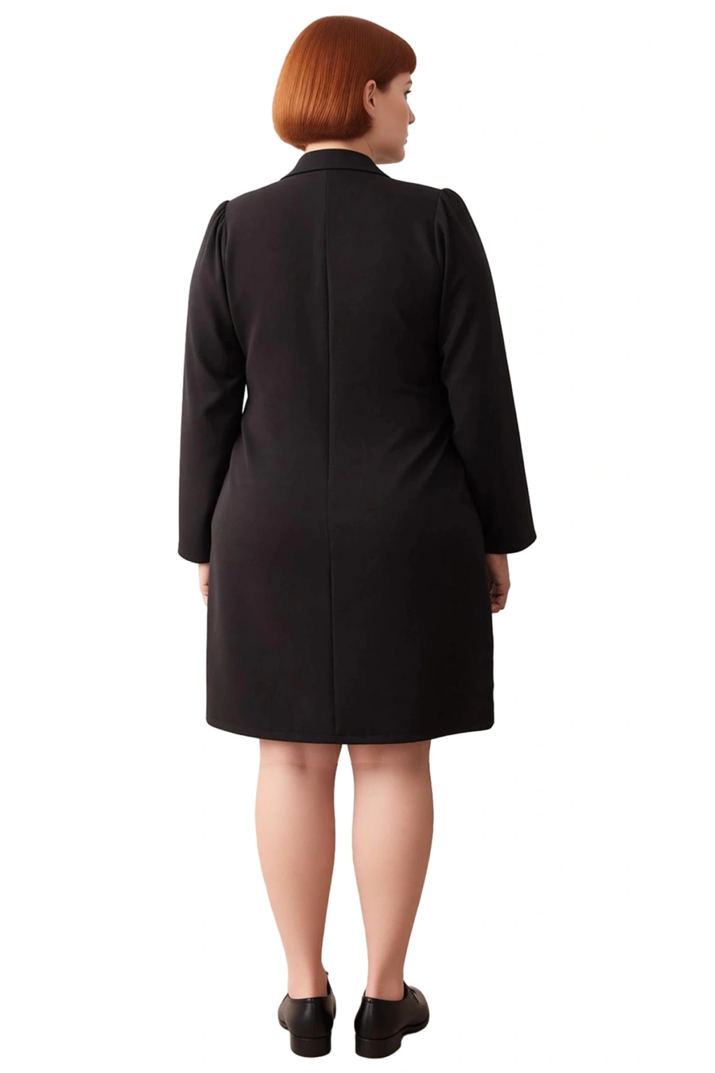 Ürün Özellikleri: A-line kalıp, polyester materyal, renk bloklu desen, bebe yaka, standart kol, dokuma kumaş, siyah renk.