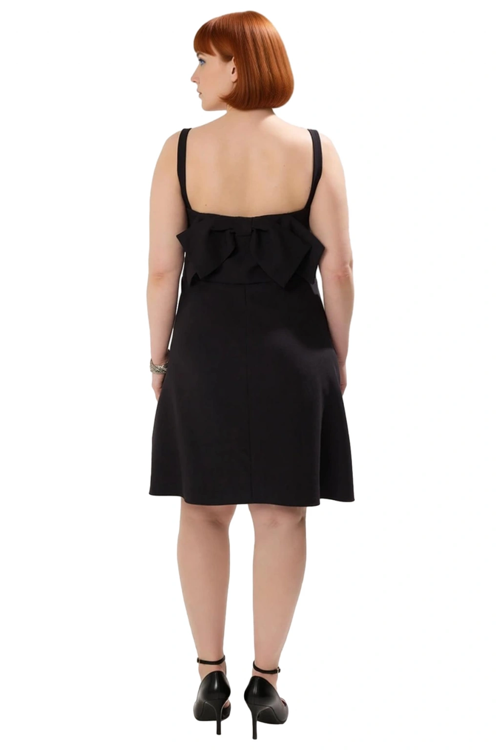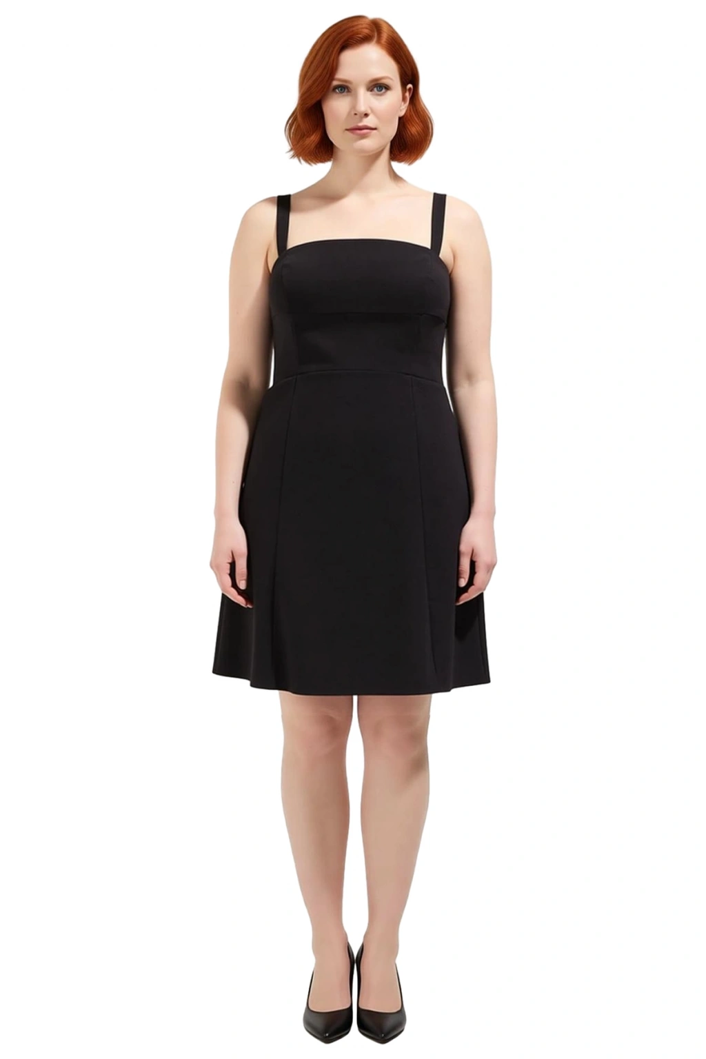 Ürün Özellikleri: A-line kalıp, polyester elastan materyal, düz desen, kare yaka, kolsuz, dokuma kumaş, kısa mini boy, siyah renk, büyük beden.