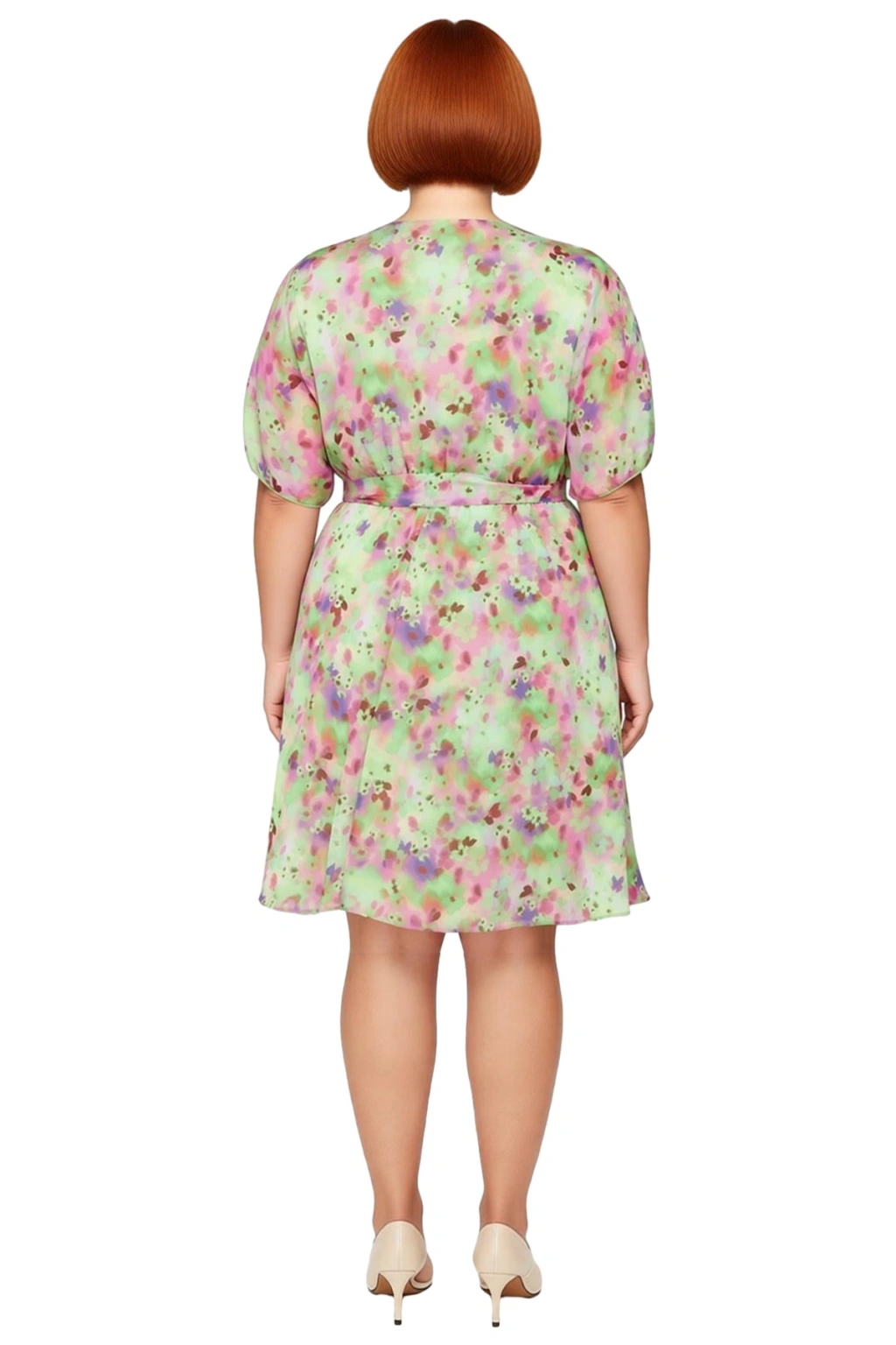 Ürün Özellikleri: A-line kalıp, 100% polyester materyal, çiçekli desen, V yaka, melek kol, şifon dokuma kumaş, çok renkli, kısa boy, astarlı, kuşaklı.