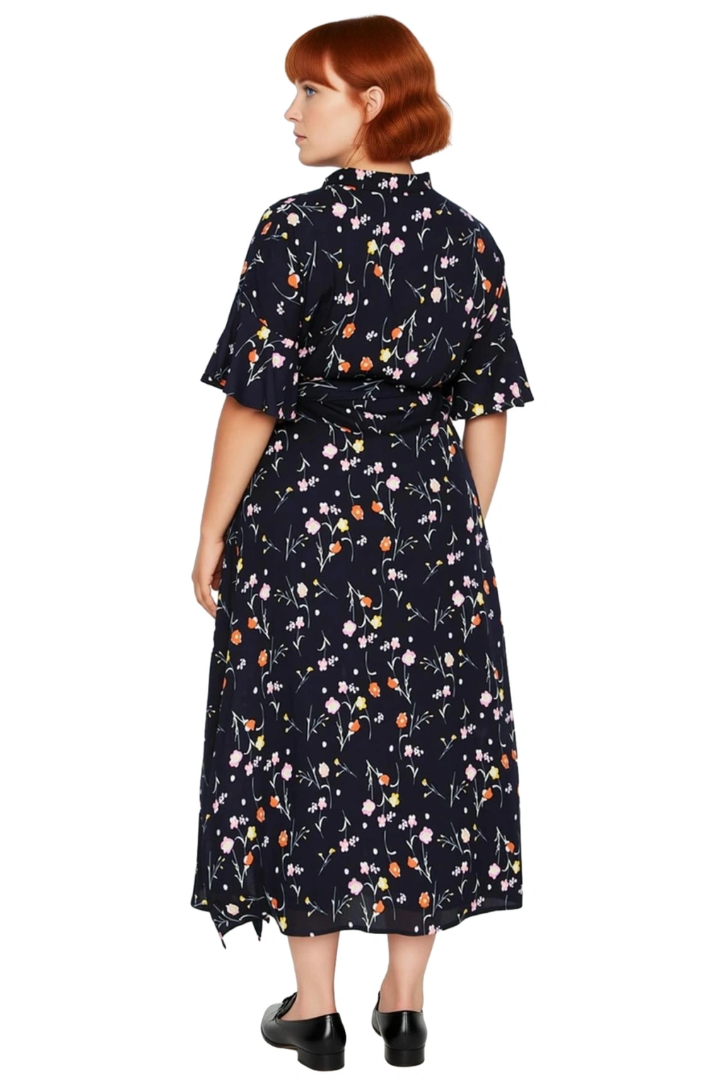 Ürün Özellikleri: A-line kalıp, %100 viskoz materyal, çiçekli desen, gömlek yaka, kısa melek kol, dokuma kumaş, lacivert renk.