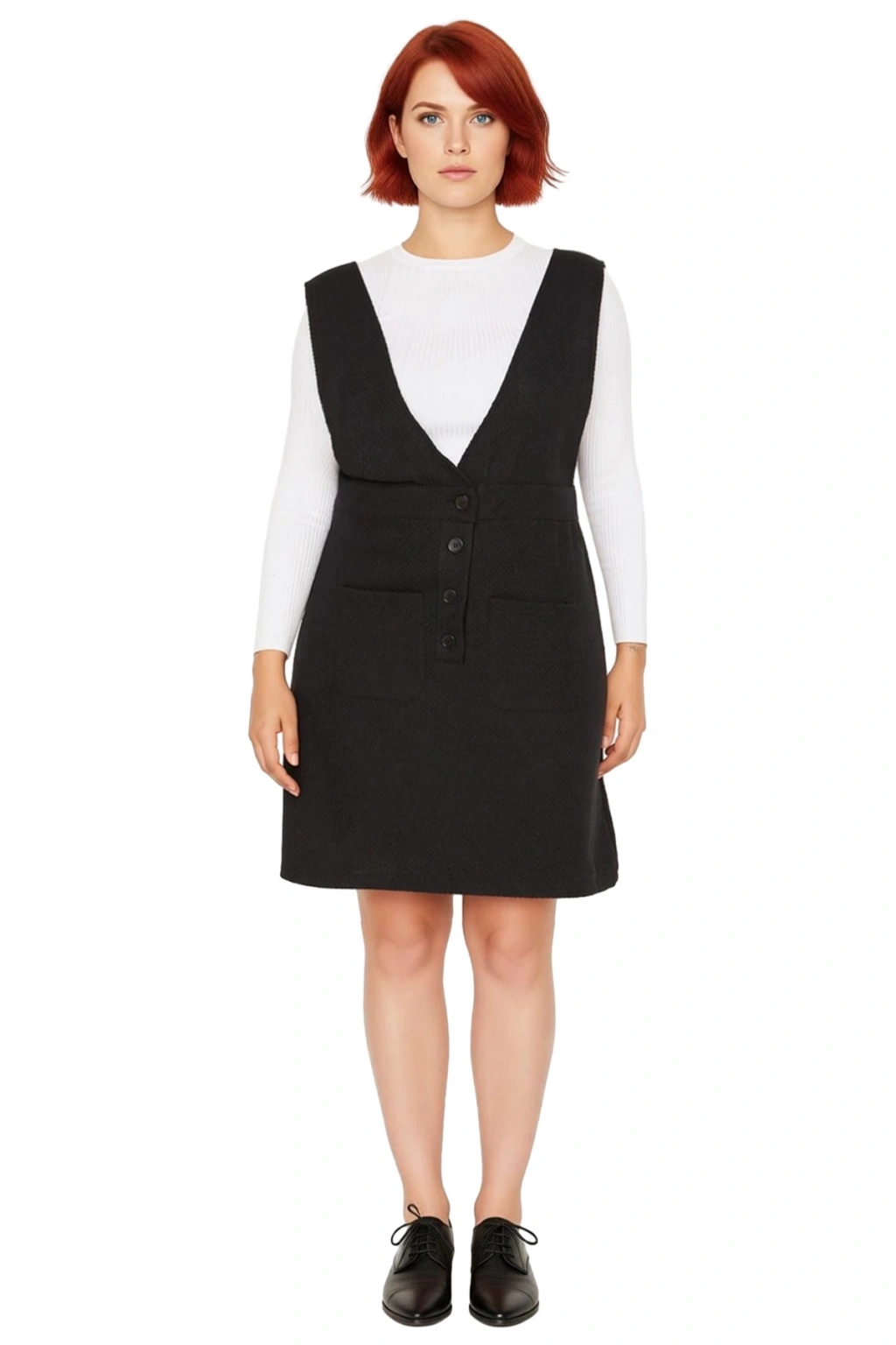 Elbisenin zarif V yaka detayı, boynu uzun göstererek feminen bir dokunuş katarken, kolsuz yapısı farklı üstlerle kombinleme imkanı sunar. Tüvit dokuma kumaşı, ürüne zengin bir tekstür kazandırırken dayanıklı yapısıyla uzun süreli kullanım vaat eder. Ön kısmında yer alan dekoratif düğme detayları ve iki adet fonksiyonel cebi, hem estetik bir görünüm sağlar hem de küçük eşyalarınızı taşıma kolaylığı sunar. Bu jile elbise, cool ve konforlu persona tanımına mükemmel uyum sağlayarak gün içinde rahatlığı ve şıklığı bir arada arayan kadınlar için idealdir. Makinede kolayca yıkanabilir özelliği sayesinde bakımı pratik ve zahmetsizdir.