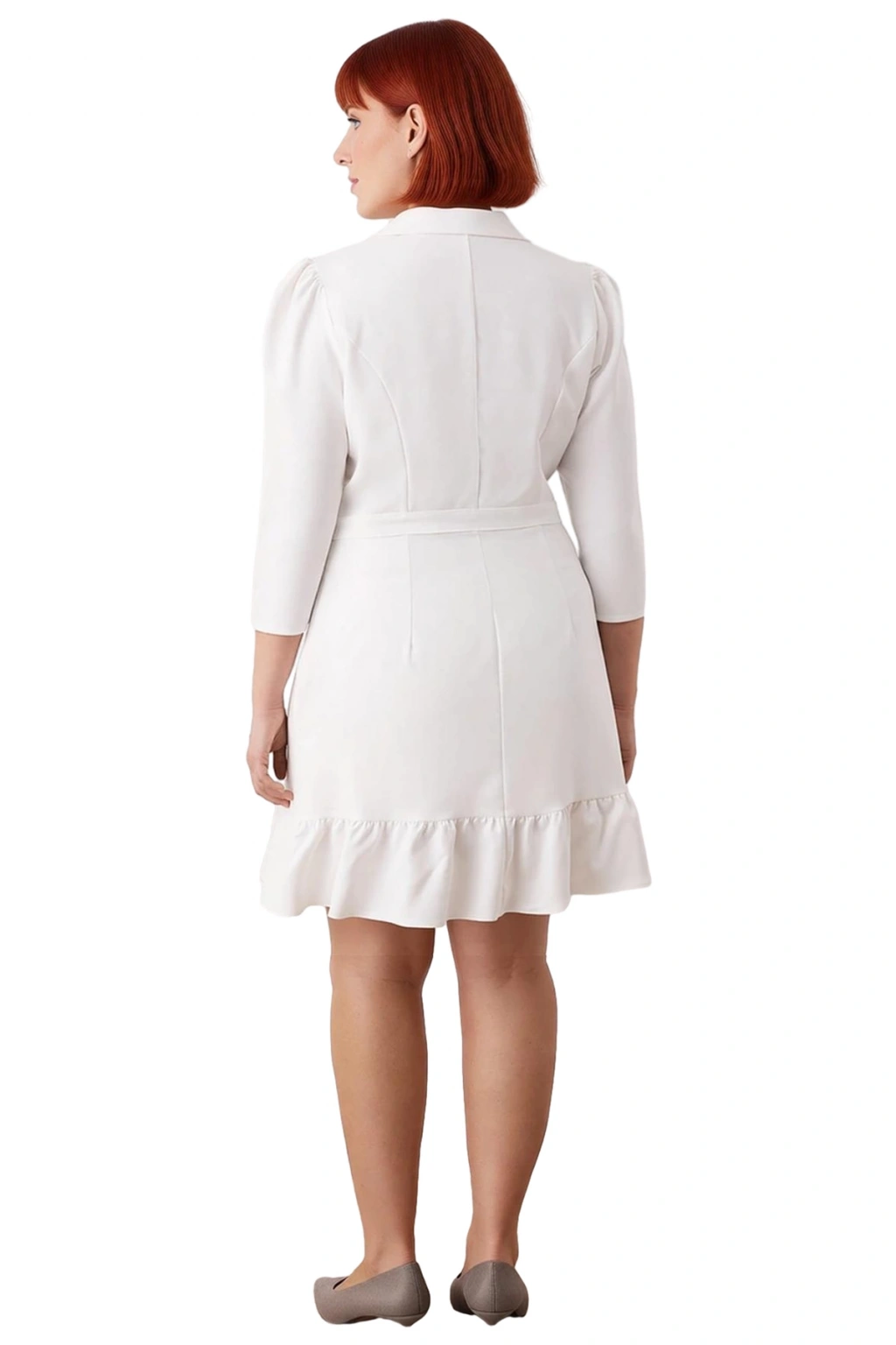 Ürün Özellikleri: Ceket elbise kalıp, polyester elastan materyal, düz desen, ceket yaka, truvakar kol, dokuma kumaş, ekru renk, kısa boy, astarsız, büyük beden, cepsiz.