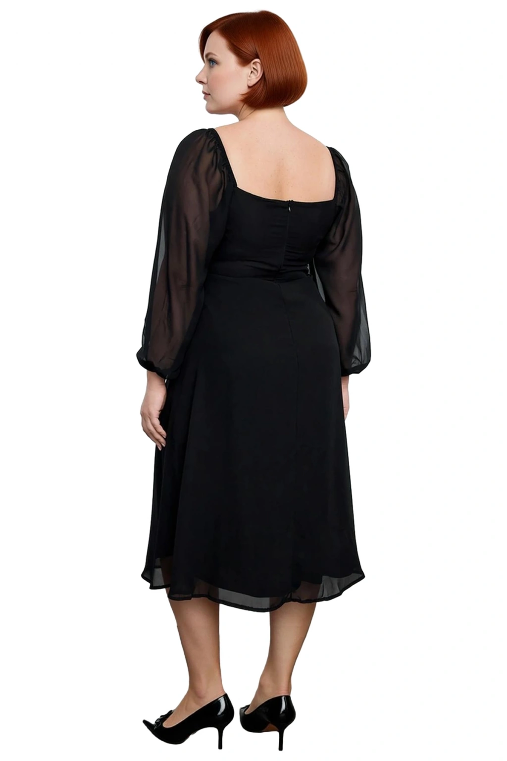 Ürün Özellikleri: A-line kalıp, polyester materyal, düz desen, kare yaka, balon kol, dokuma şifon kumaş, siyah renk, astarlı tasarım.