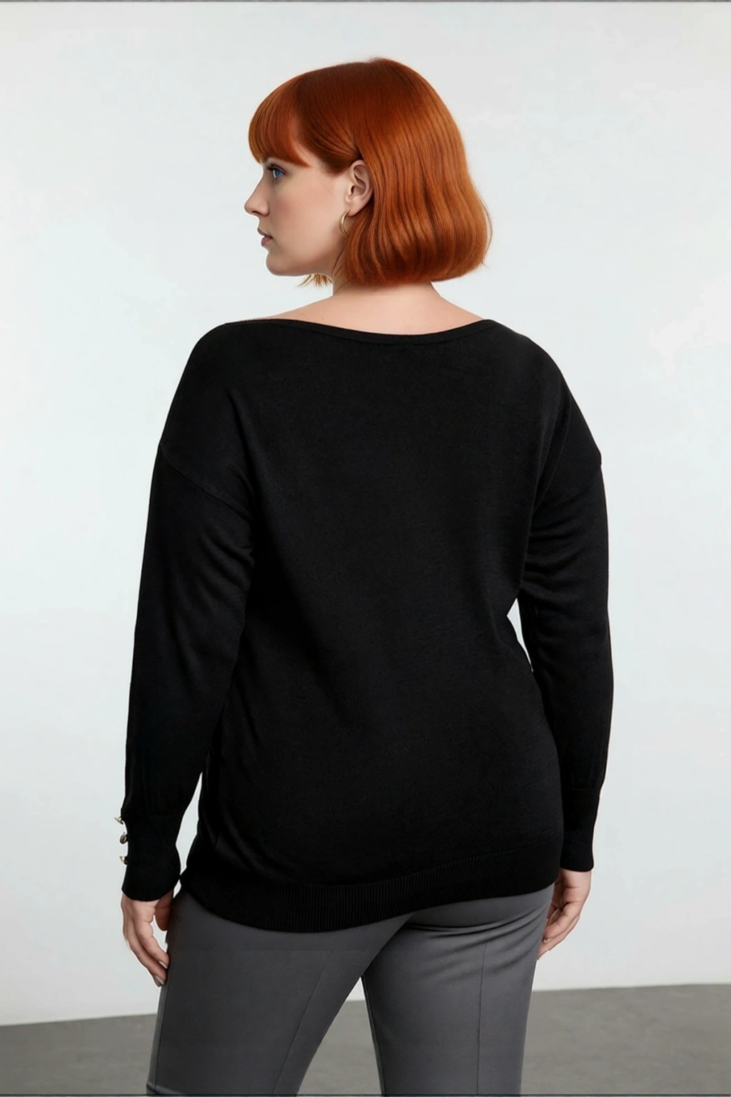 Ürün Özellikleri: Regular kalıp, 100% akrilik materyal, düz desen, kayık yaka, standart kol, triko kumaş, siyah renk, baskısız tasarım, büyük beden koleksiyon.