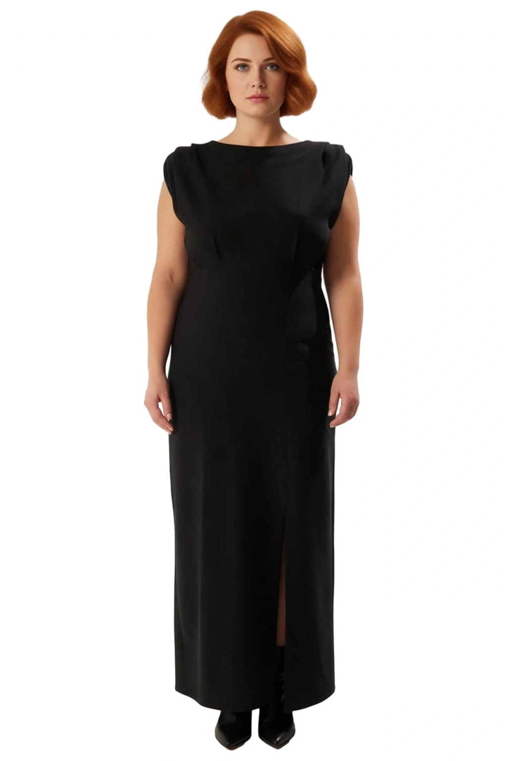 Ürün Özellikleri: A-line kalıp, polyester elastan materyal, düz desen, kayık yaka, kolsuz, dokuma kumaş, siyah renk.