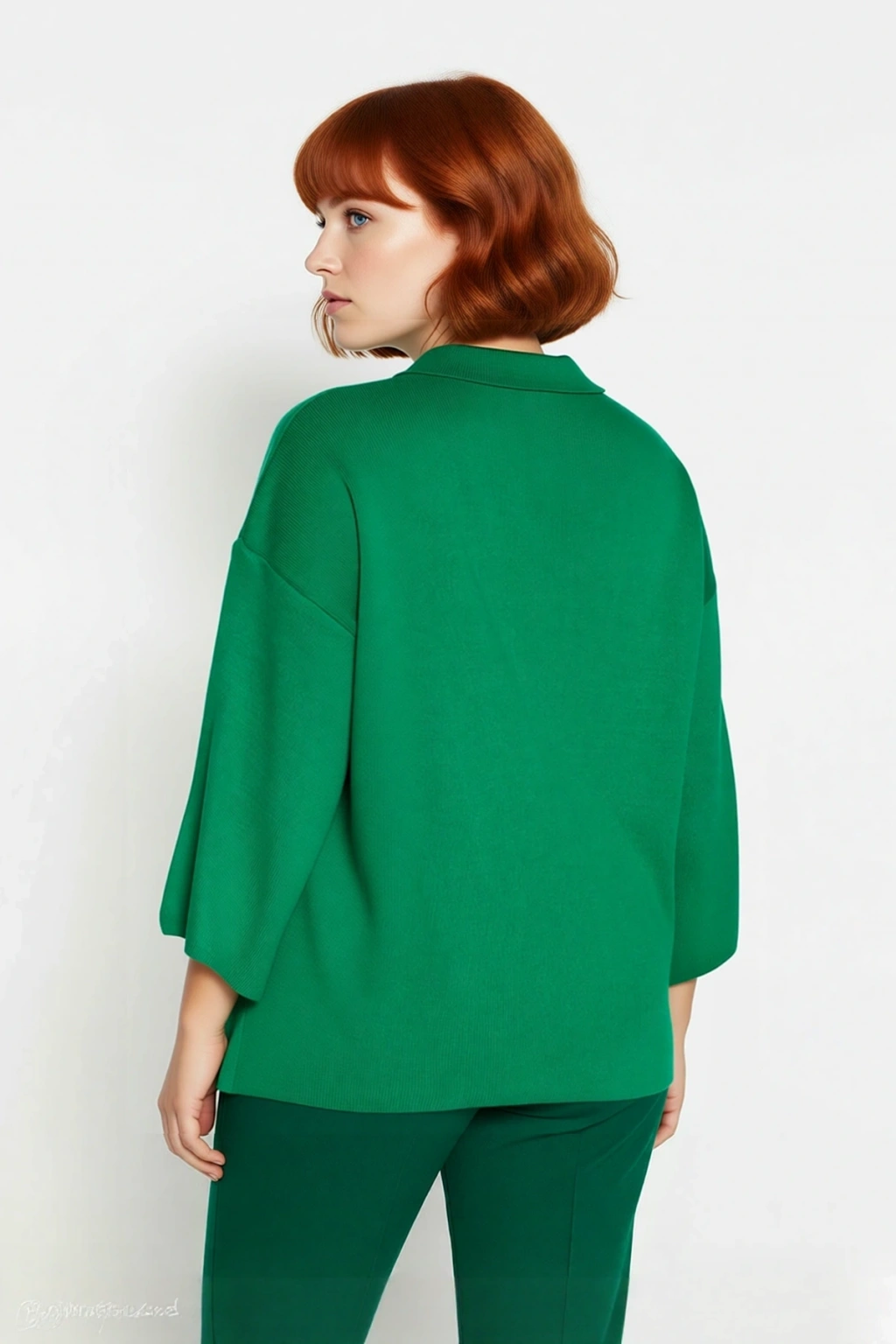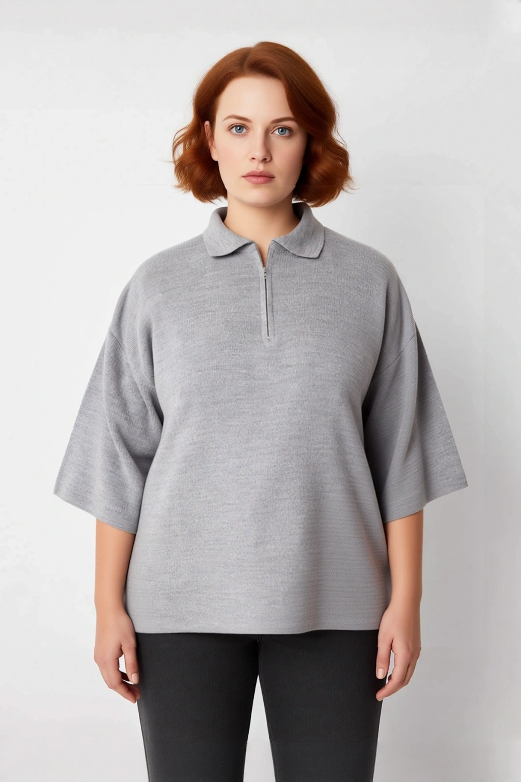 Ürün Özellikleri: Relaxed kalıp, akrilik materyal, düz desen, polo yaka, düşük omuz, truvakar kol, triko kumaş, gri renk, baskısız tasarım, fermuarlı, orta kalınlık, cepsiz.