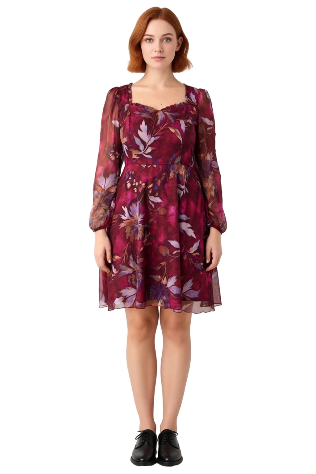 Ürün Özellikleri: A-line kalıp, 100% polyester materyal, geometrik desen, kalp yaka, uzun balon kol, dokuma şifon kumaş, bordo çok renkli.