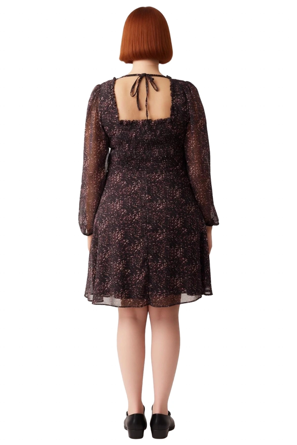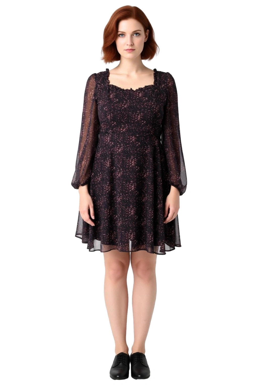 Elbisenin dikkat çekici kalp yaka tasarımı, boyun ve omuz çizgisini nazikçe vurgularken, uzun balon kol detayları modern ve sofistike bir görünüm kazandırır. Şifon kumaşın ince dokusu, elbisenin hareketini artırır ve her adımda hafif bir salınım yaratır. Dokuma kumaş yapısı sayesinde nefes alabilir özelliktedir ve geçiş mevsimlerinde ideal bir sıcaklık dengesi sunar. T10 yıkama talimatına uygun olarak makinede kolayca yıkanabilir olması, yoğun yaşam temposunda büyük avantaj sağlar.