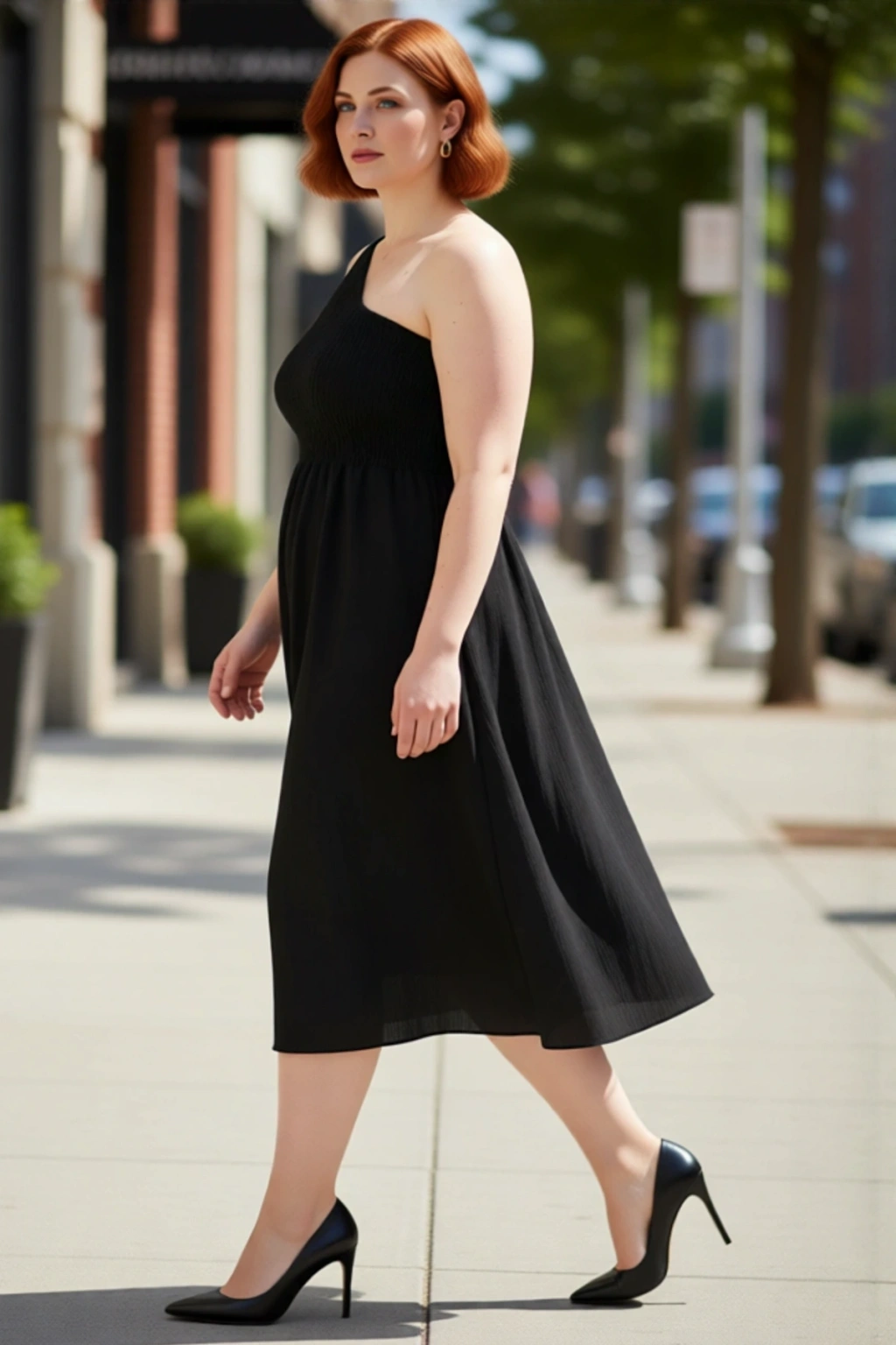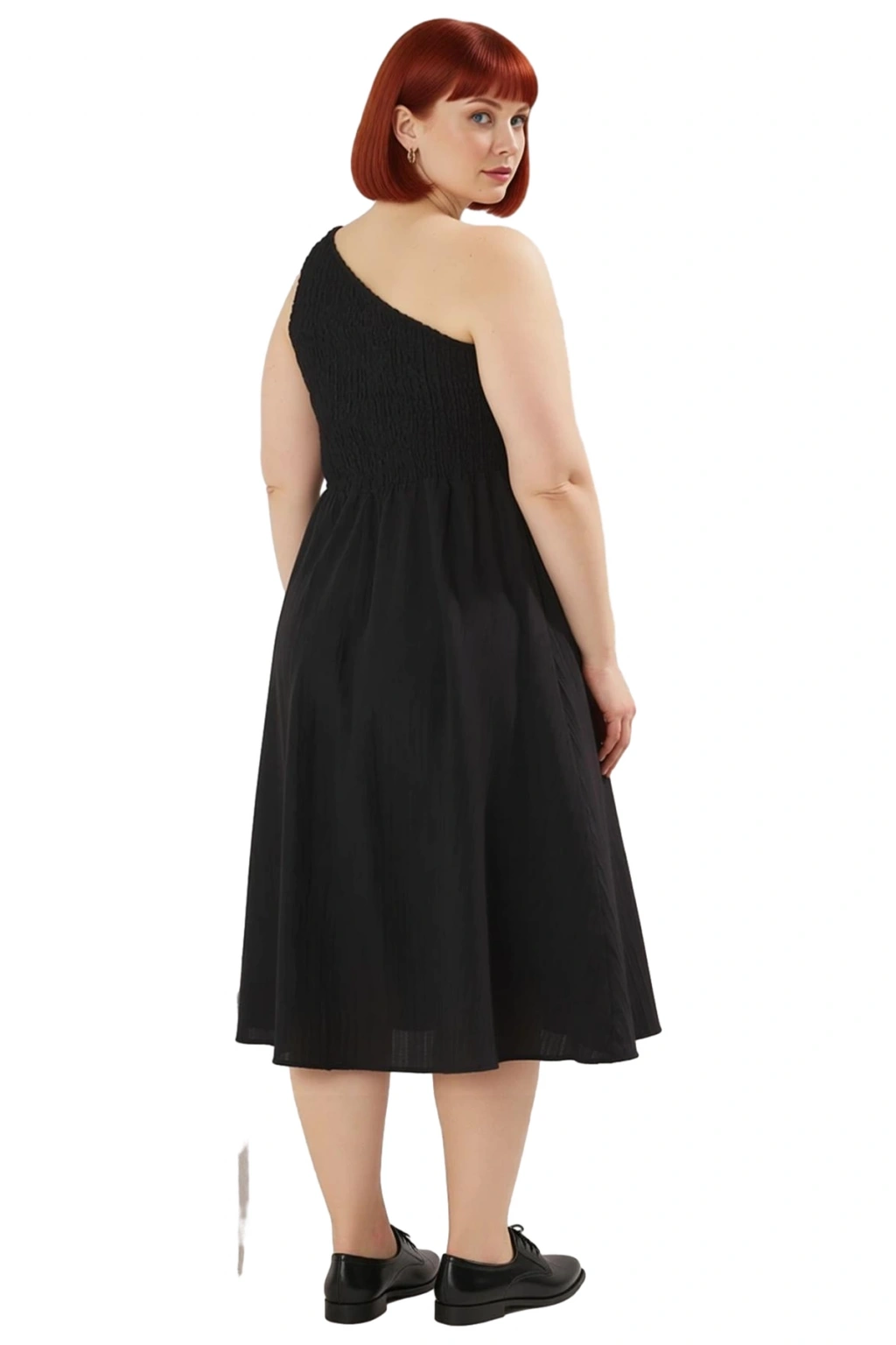Ürün Özellikleri: A-line kalıp, polyester elastan materyal, düz desen, asimetrik yaka, tek kol, dokuma kumaş, siyah renk.