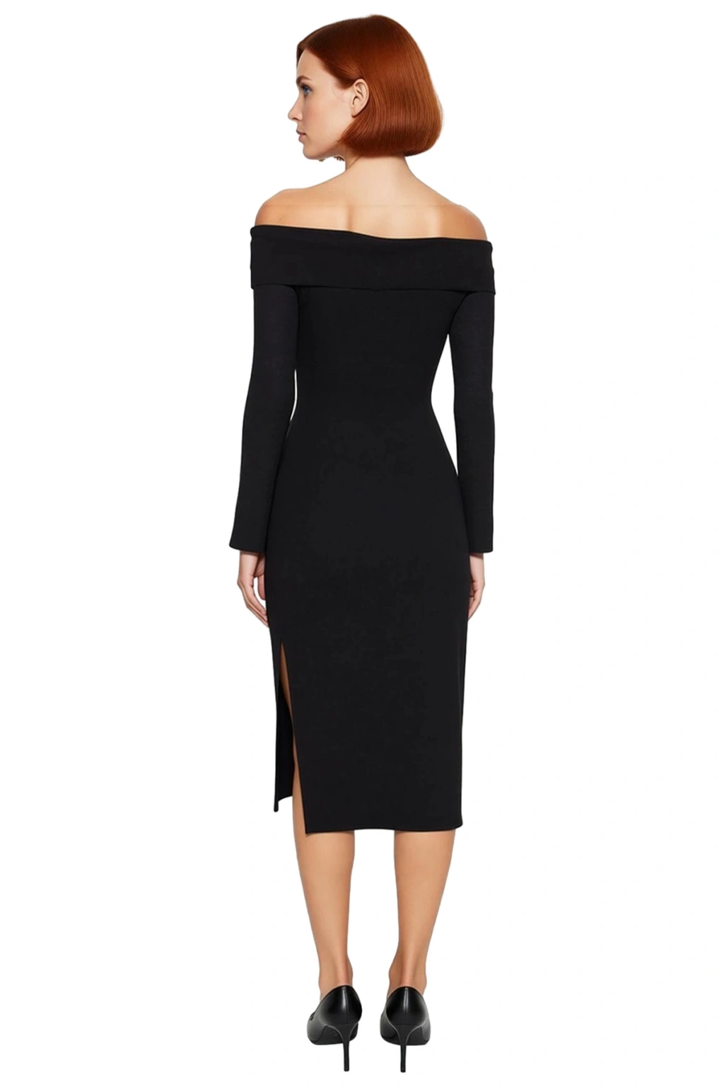 Ürün Özellikleri: Bodycon kalıp, polyester karışımlı materyal, düz desen, carmen yaka, düşük ve uzun kol, örme kumaş, bordo renk, baskısız tasarım, yırtmaçlı.