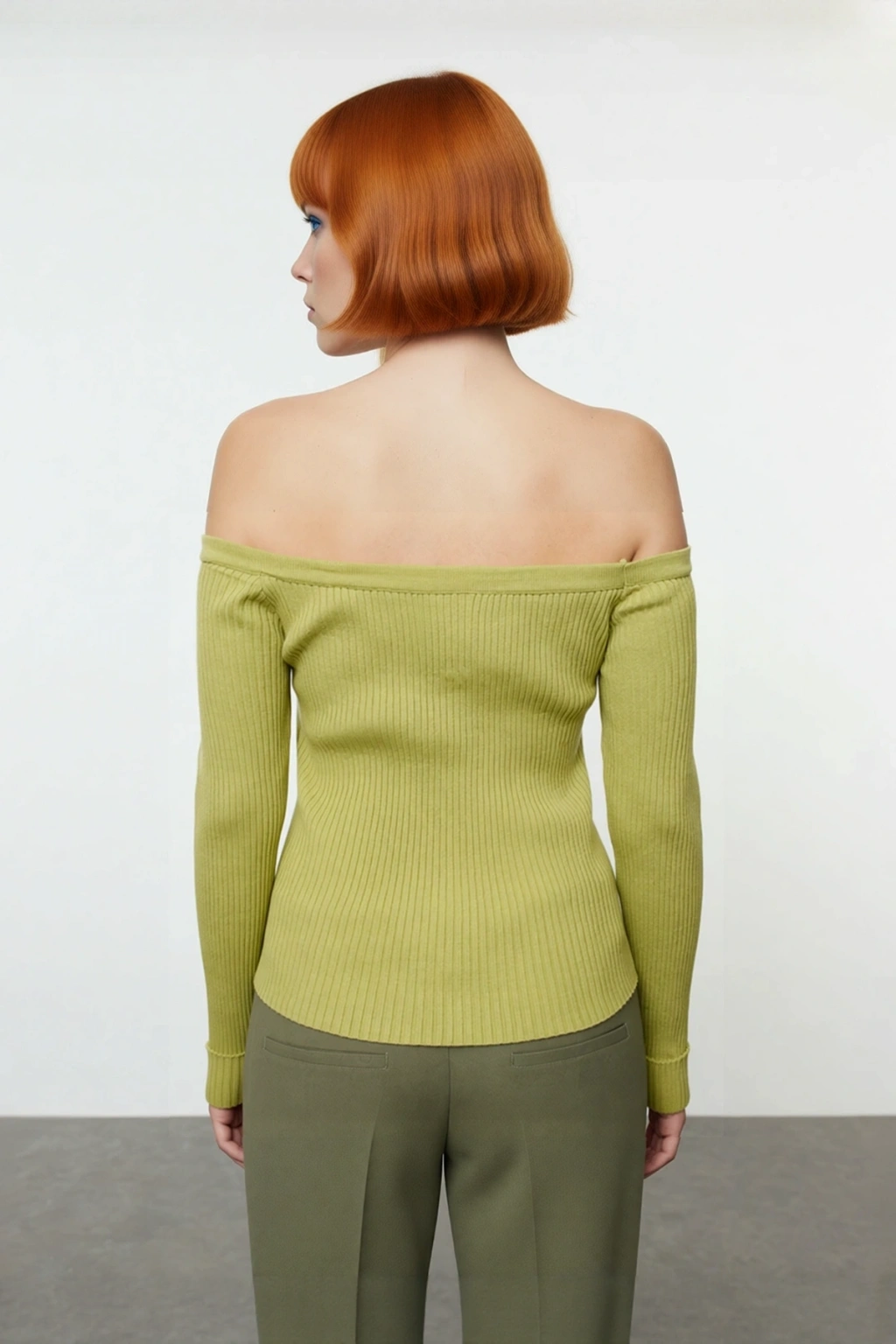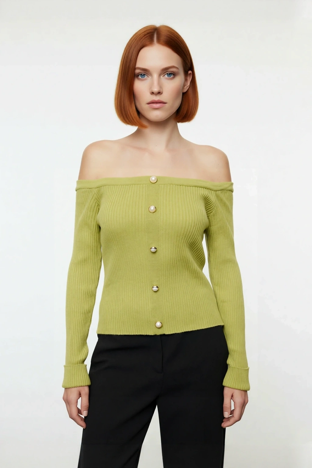Ürün Özellikleri: Fitted kalıp, akrilik materyal, düz desen, Carmen yaka, standart kol, triko kumaş, yeşil renk, cepsiz tasarım.