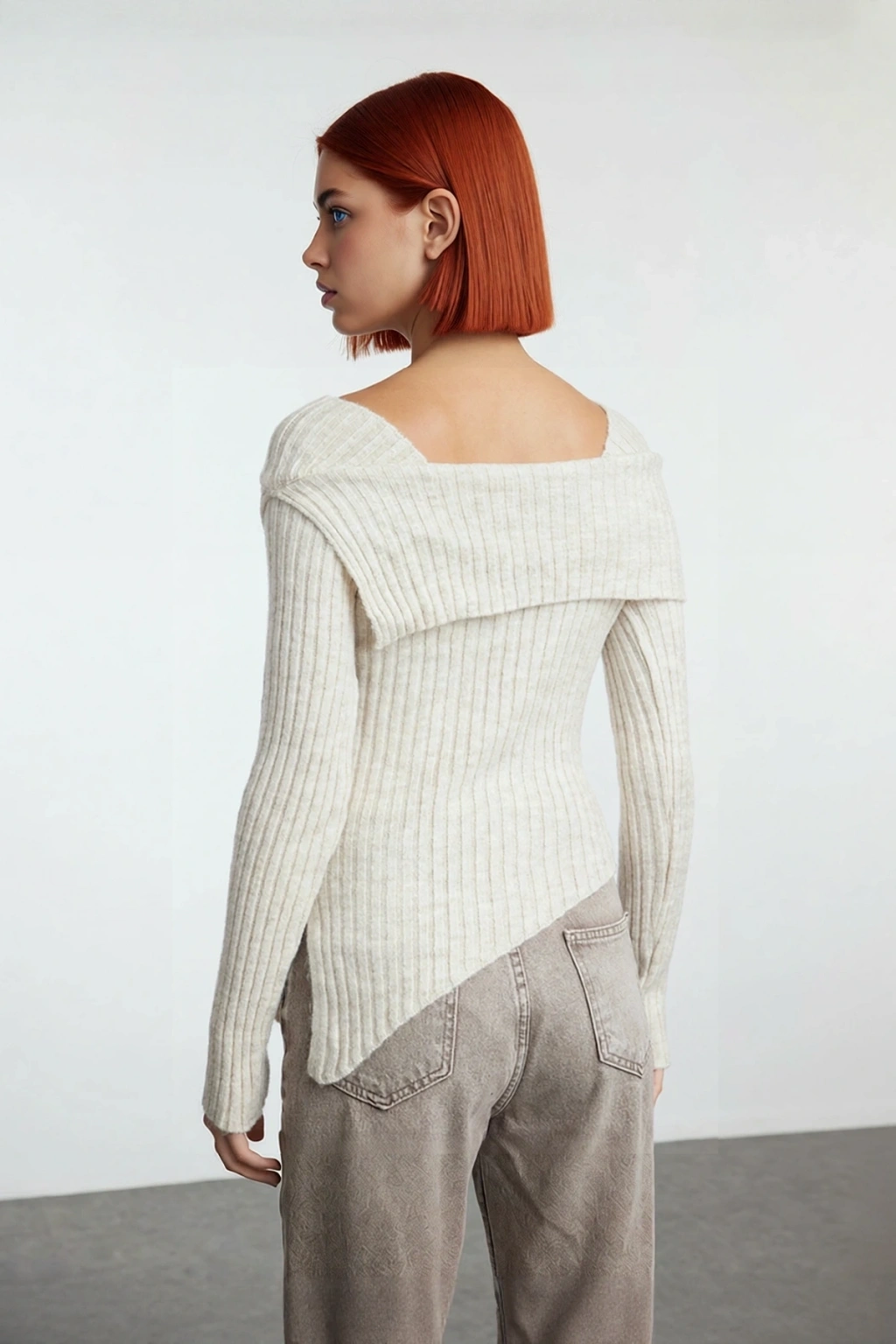 Ürün Özellikleri: Fitted kalıp, akrilik polyester materyal, düz desen, carmen yaka, standart kol, triko kumaş, bej renk, baskısız tasarım.