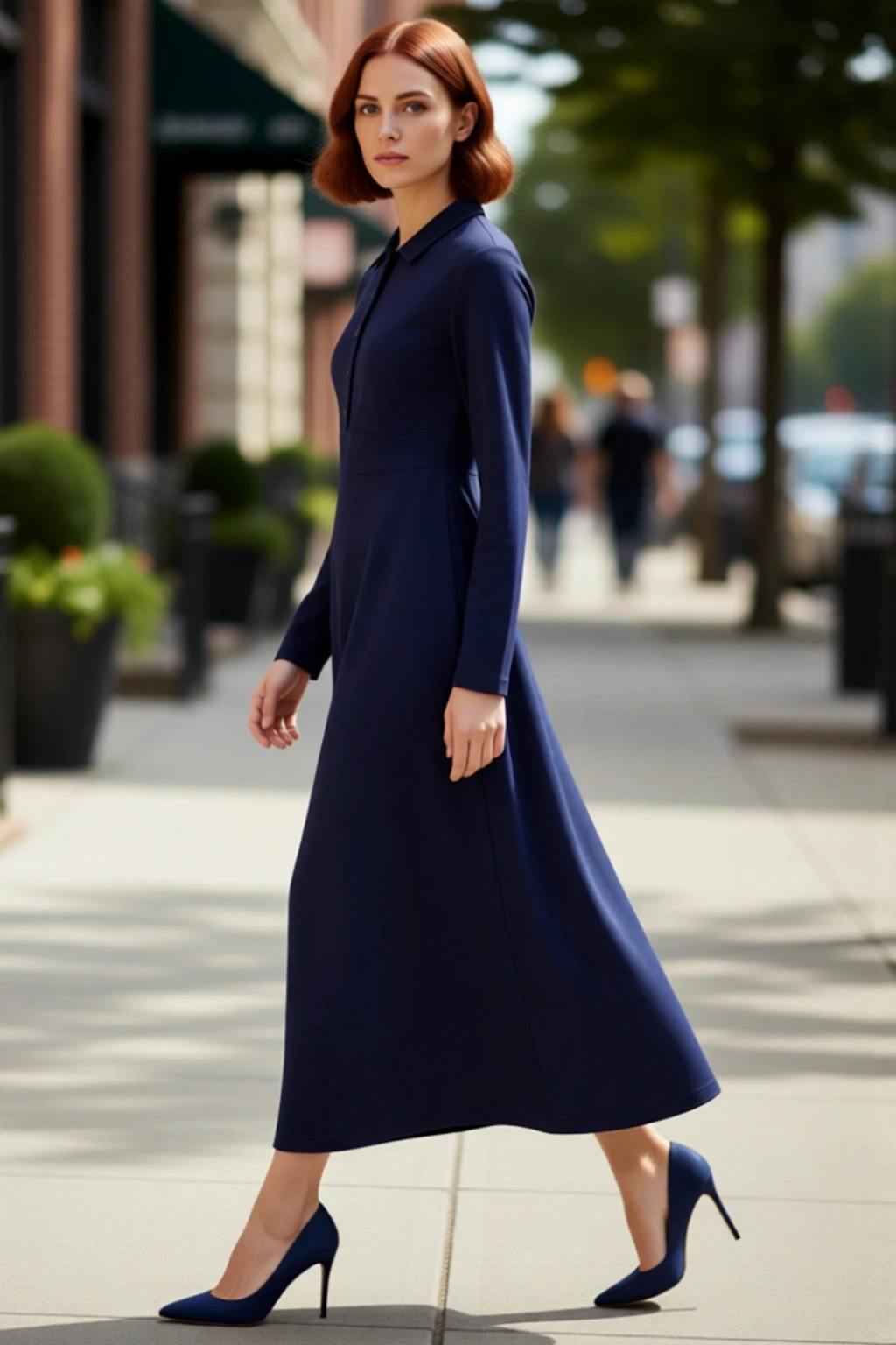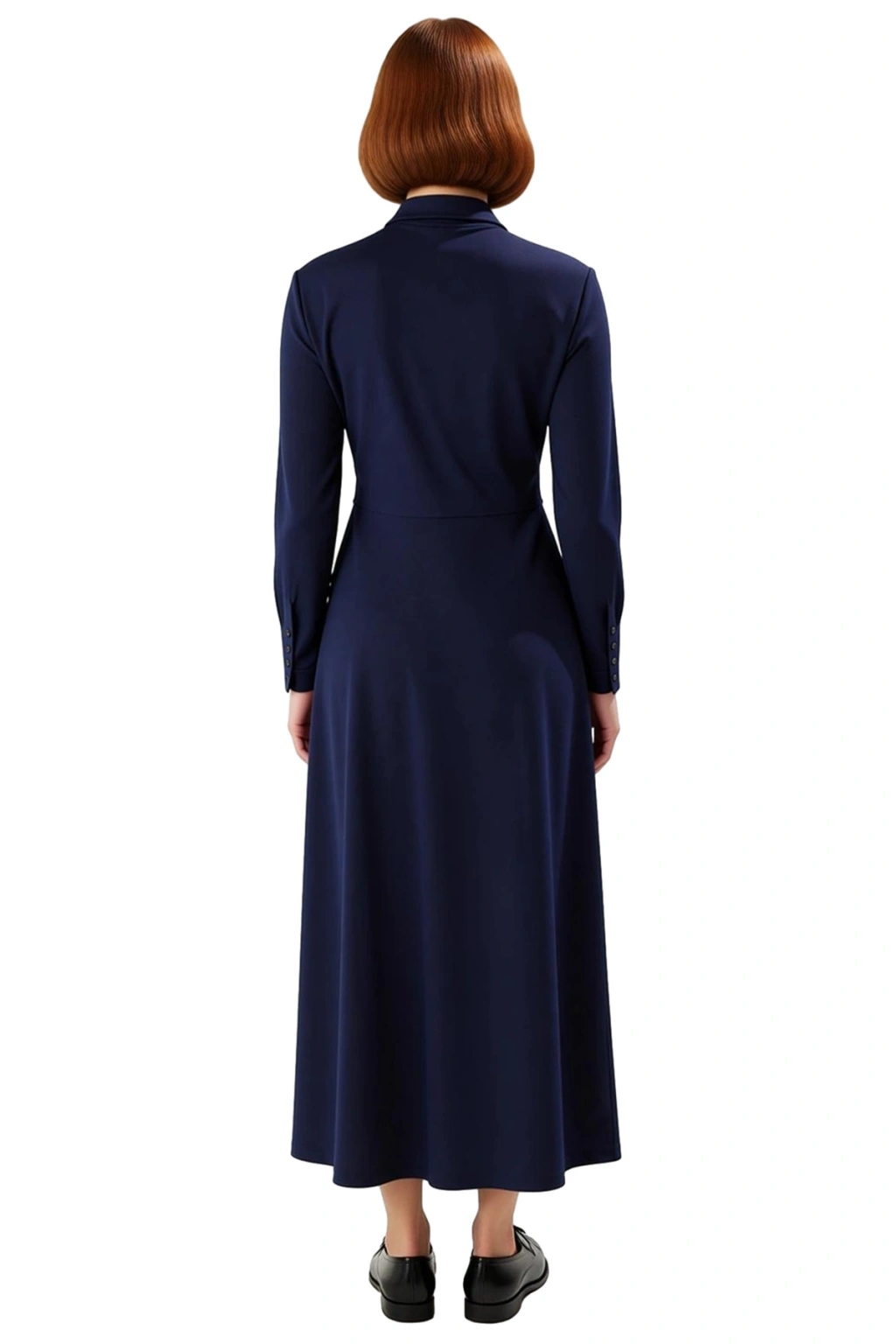 Ürün Özellikleri: A-line kalıp, polyester materyal, düz desen, polo yaka, standart kol, örme krep kumaş, lacivert renk, maxi boy.