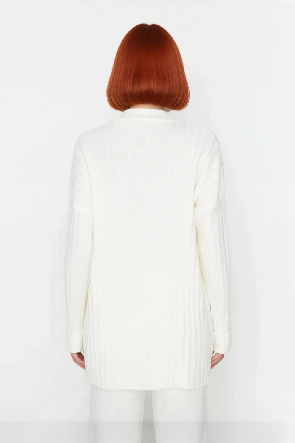 Ürün Özellikleri: Relaxed kalıp, akrilik polyester materyal, düz desen, düğmeli yaka, düşük kol, triko kumaş, ekru renk.