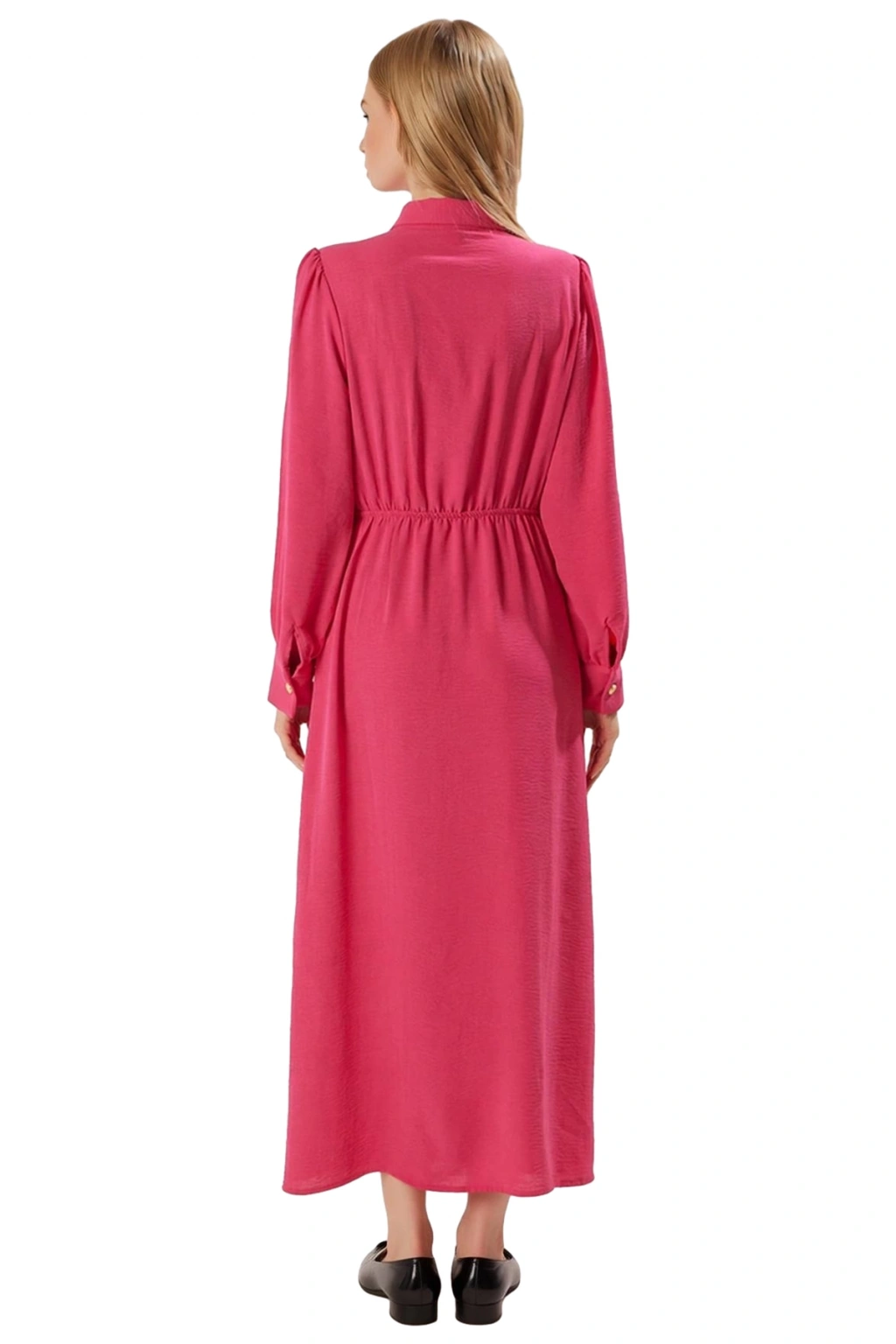 Ürün Özellikleri: Skater kalıp, polyester materyal, düz desen, gömlek yaka, standart kol, dokuma kumaş, pembe renk, maxi boy.