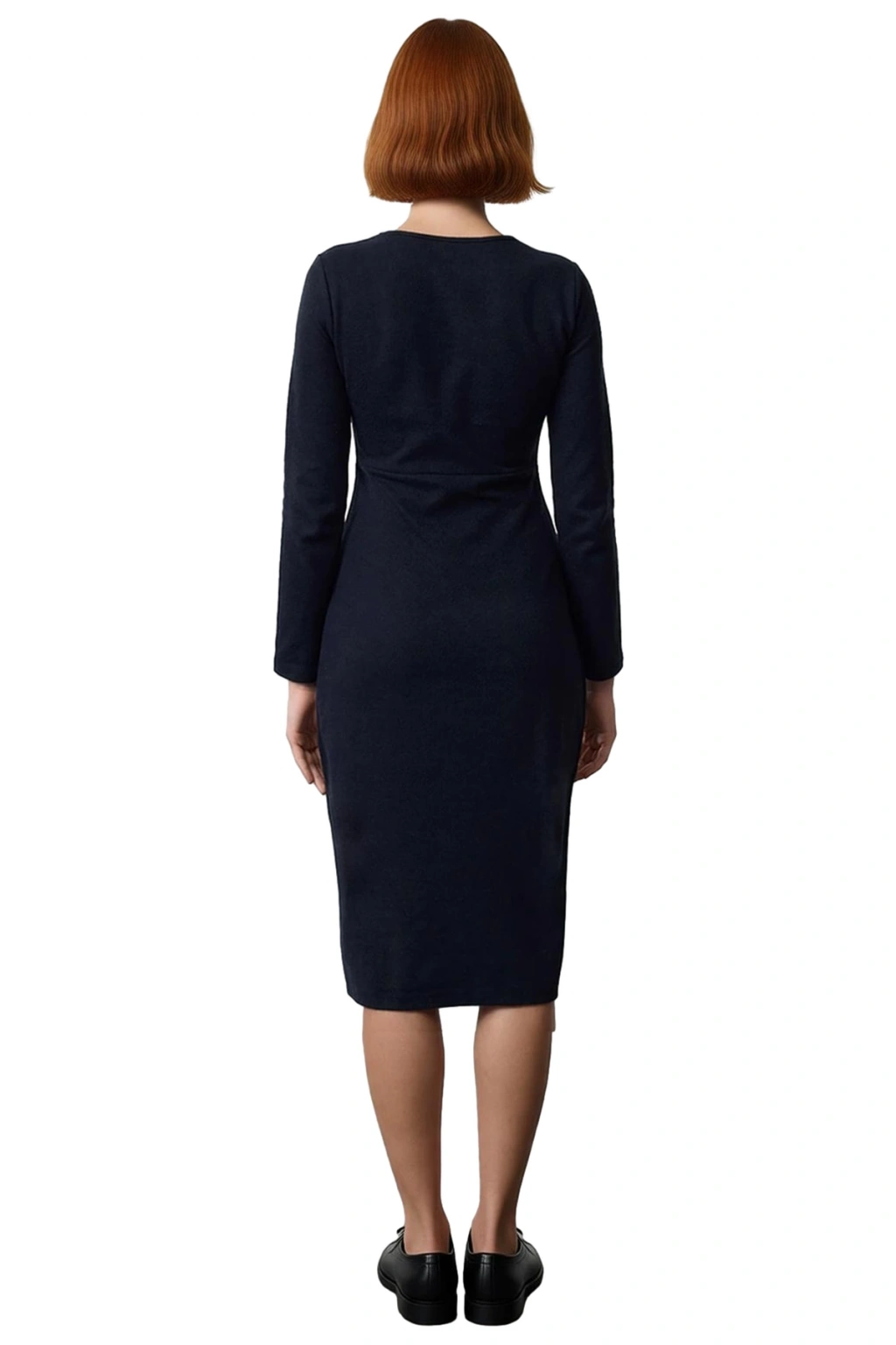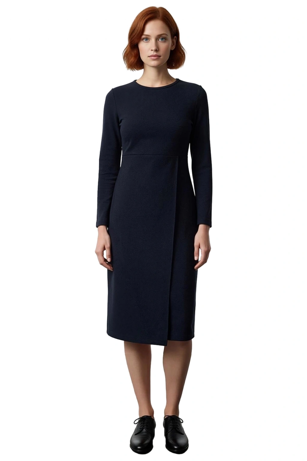 Ürün Özellikleri: Shift kalıp, polyester karışımlı materyal, düz desen, bisiklet yaka, standart kol, örme kumaş, lacivert renk, kruvaze siluet.