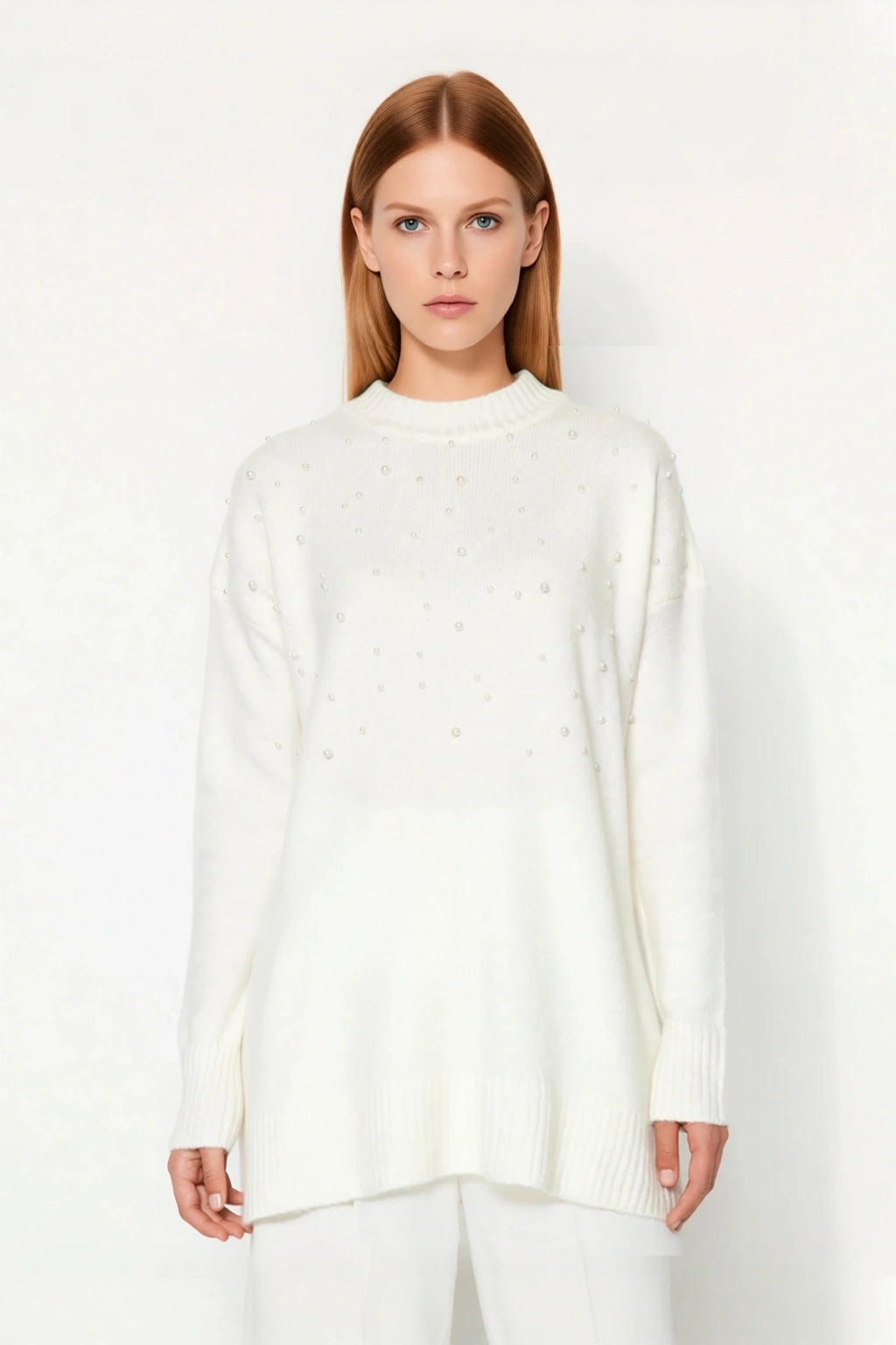 Modern ve rahatlığın mükemmel uyumu olan bu kadın triko kazak, relaxed kalıbı ile gün boyu özgür bir kullanım sunar. Yüksek kaliteli akrilik, polyester ve elastan materyal bileşimi sayesinde teninize nazikçe dokunurken, orta kalınlıktaki triko dokusu kış soğuklarına karşı ideal bir koruma sağlar. Düz bir zeminde zarifçe parlayan inci işlemeleri, kazağa benzersiz bir şıklık ve feminen bir dokunuş katmaktadır. Ekru rengi, sadeliği ve zarafeti bir araya getirir.