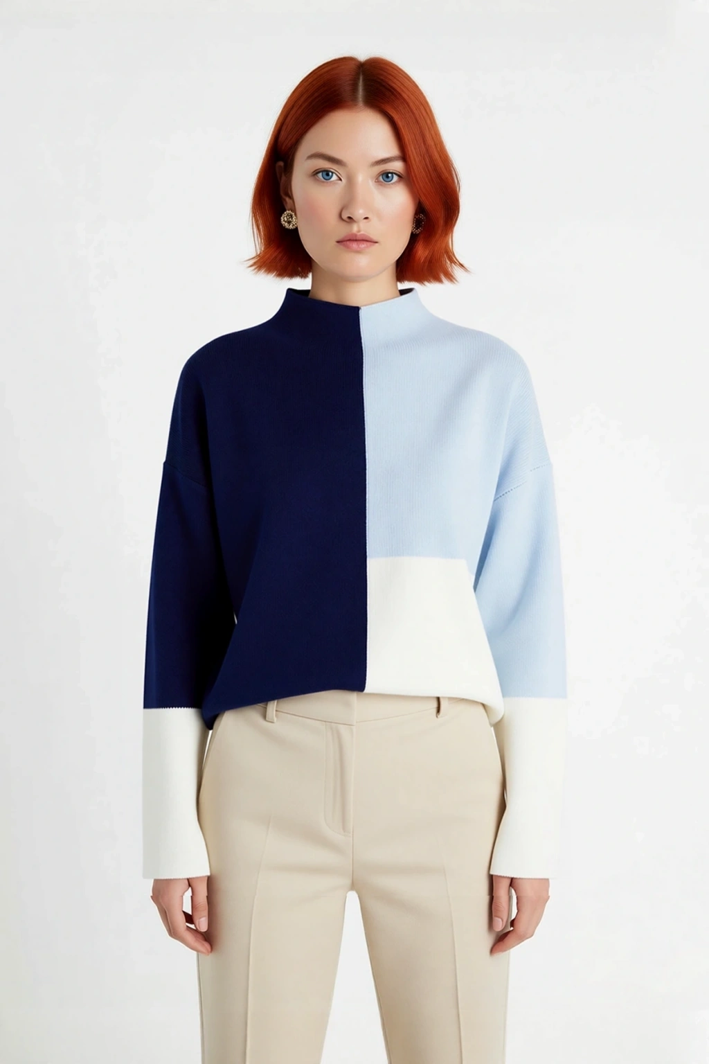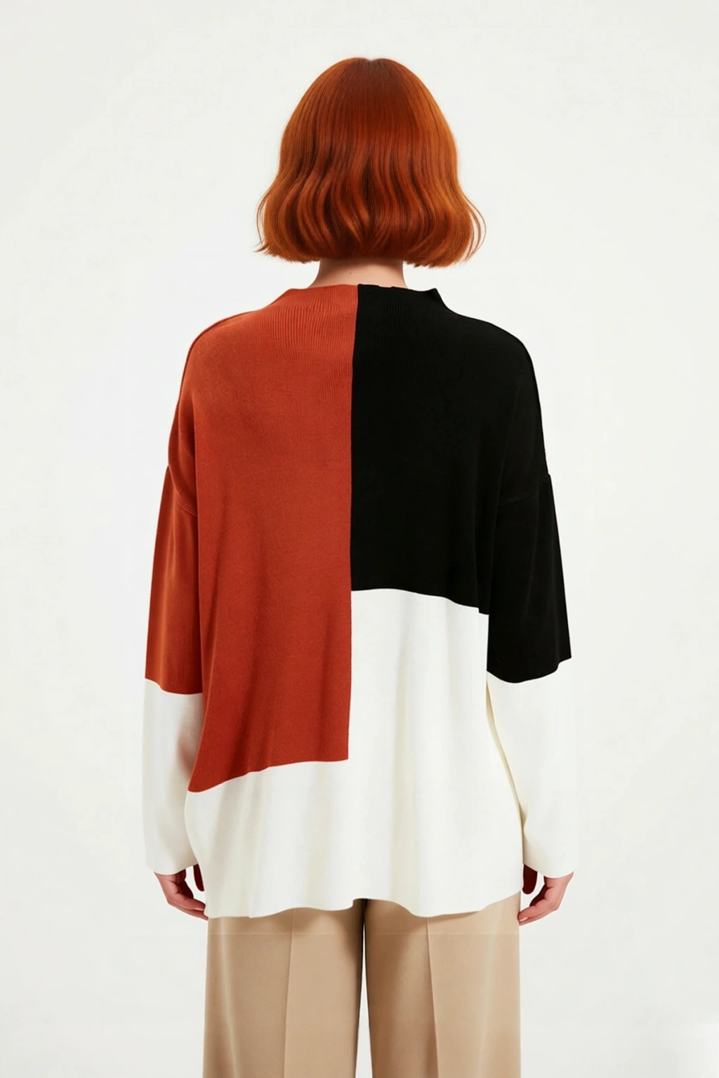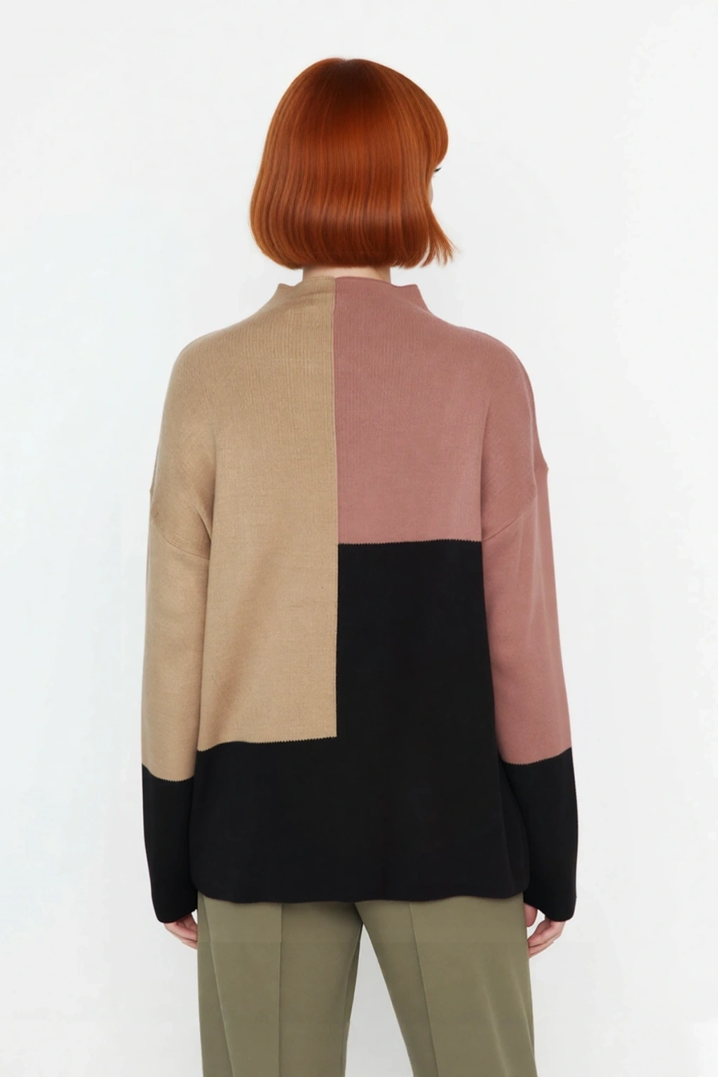 Ürün Özellikleri: Relaxed kalıp, akrilik materyal, renk bloklu desen, dik yaka, standart kol, triko kumaş, kahverengi renk, basic siluet.