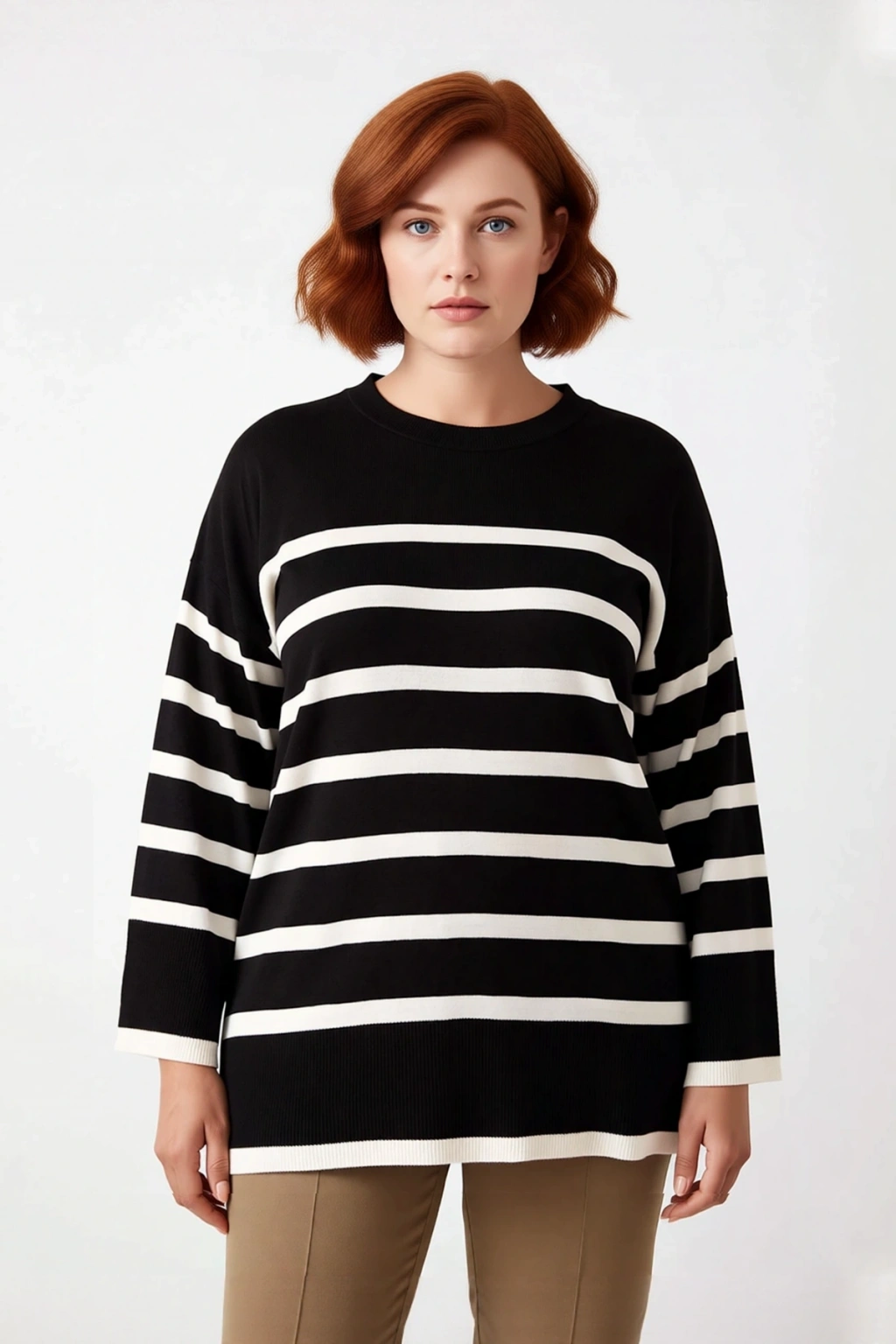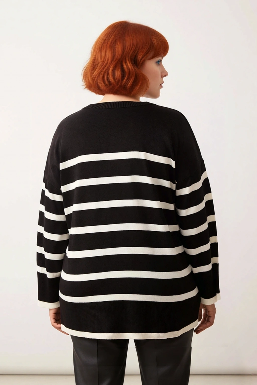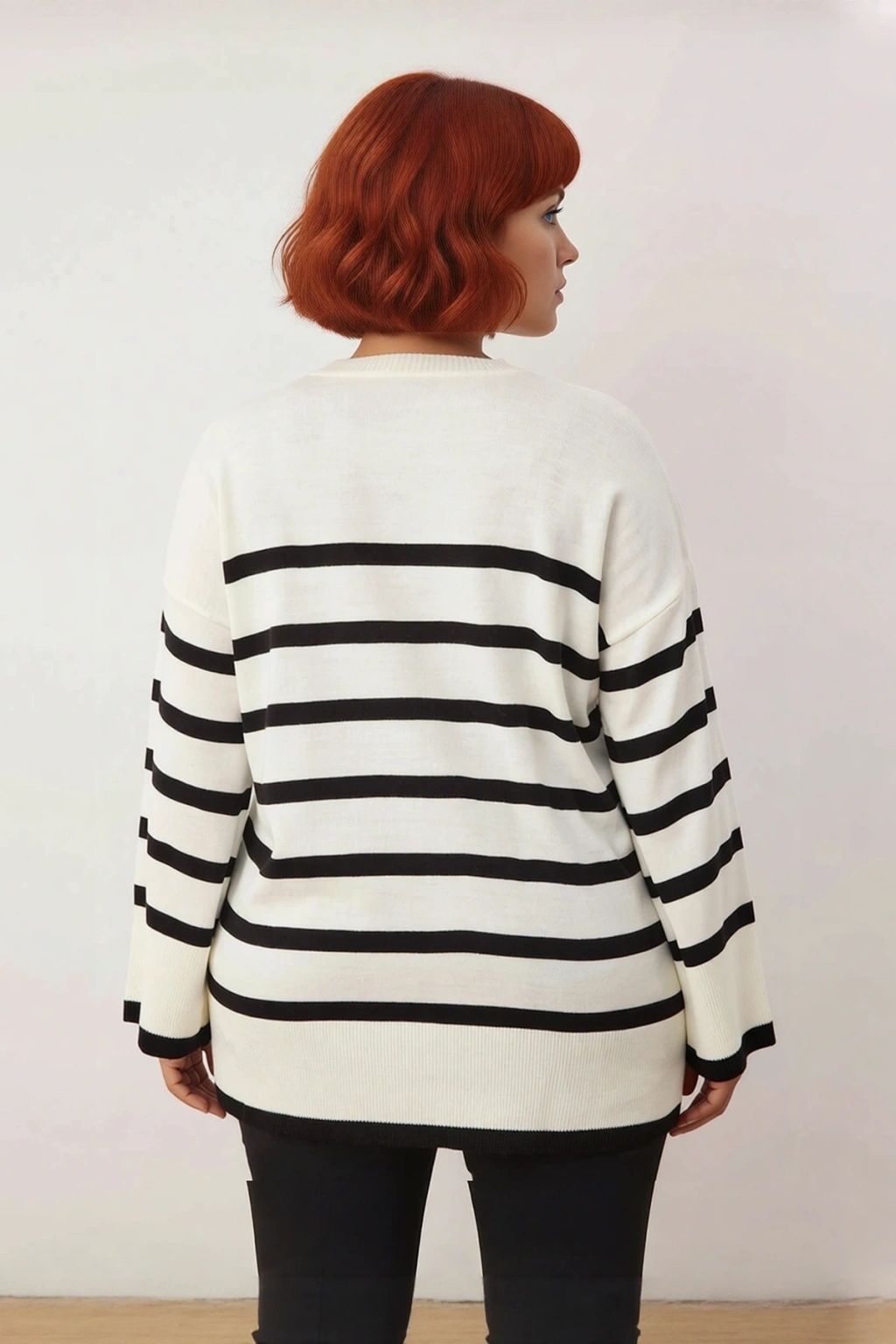 Kadınlar için tasarlanan bu eşsiz triko kazak, relaxed kalıbı ile günün her anında maksimum konfor ve stil sunar. Yüzde yüz akrilik materyalden üretilmiş olması sayesinde, soğuk kış günlerinde sizi sıcacık tutarken, cildinize narin bir dokunuş sağlar. Klasik ve şık çizgili deseni, ekru ana renk üzerine kontrast oluşturan siyah şeritlerle modern bir hava katarken, baskısız yüzeyi sade ve rafine bir görünüm oluşturur. Casual ortamlar için ideal olan bu parça, gündelik şıklığınızı zahmetsizce tamamlar ve her mevsim geçişinde kurtarıcınız olur.