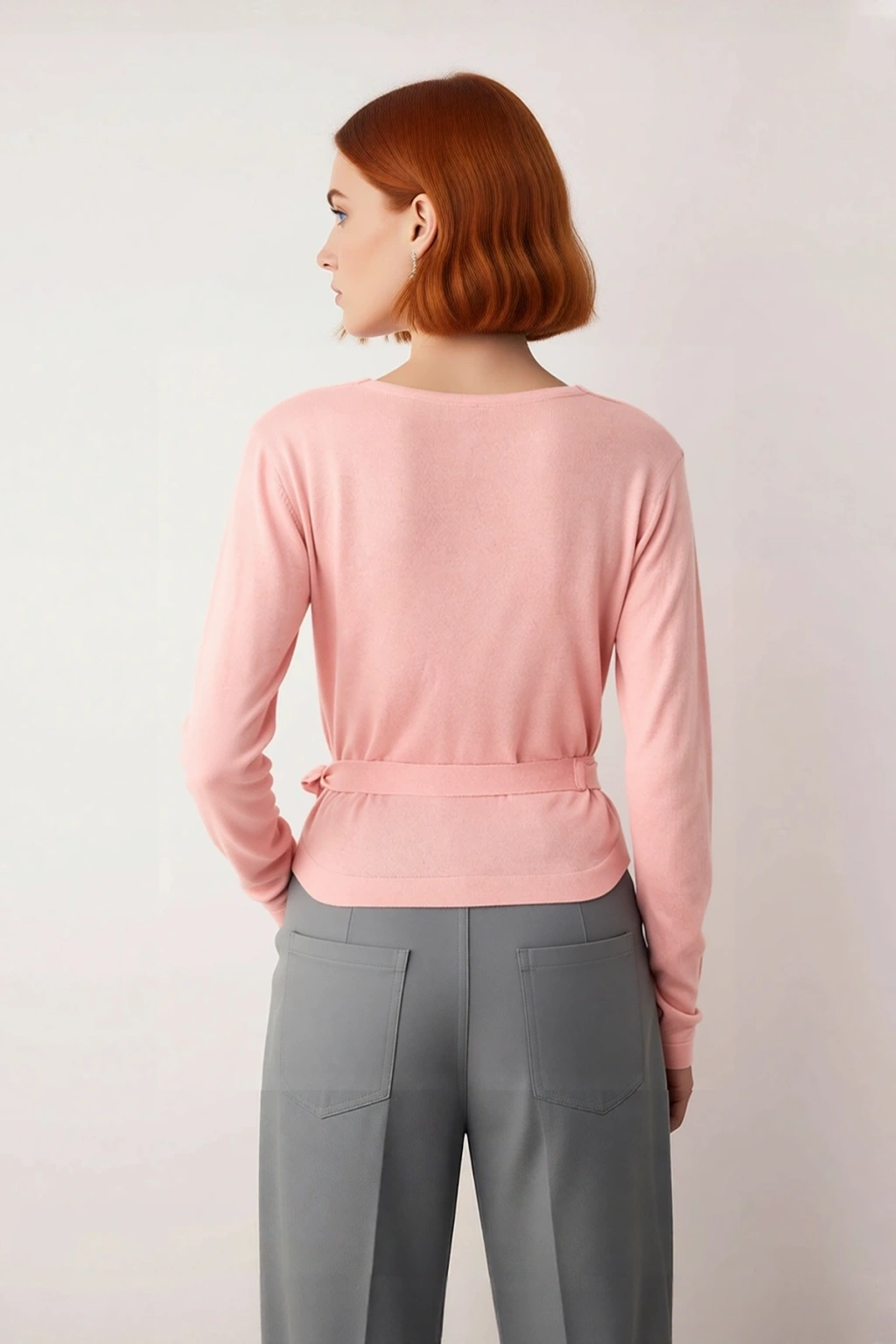 Ürün Özellikleri: Regular kalıp, akrilik viskoz materyal, düz desen, kruvaze yaka, standart kol, triko kumaş, pembe renk.
