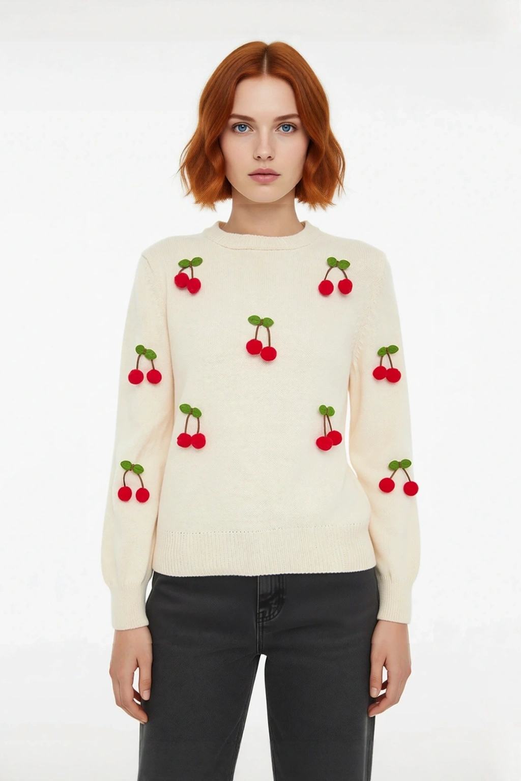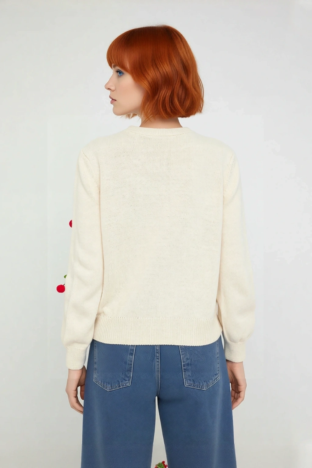 Ürün Özellikleri: Regular kalıp, %100 akrilik materyal, nakışlı işlemeli desen, bisiklet yaka, standart uzun kol, triko kumaş, fildişi renk.