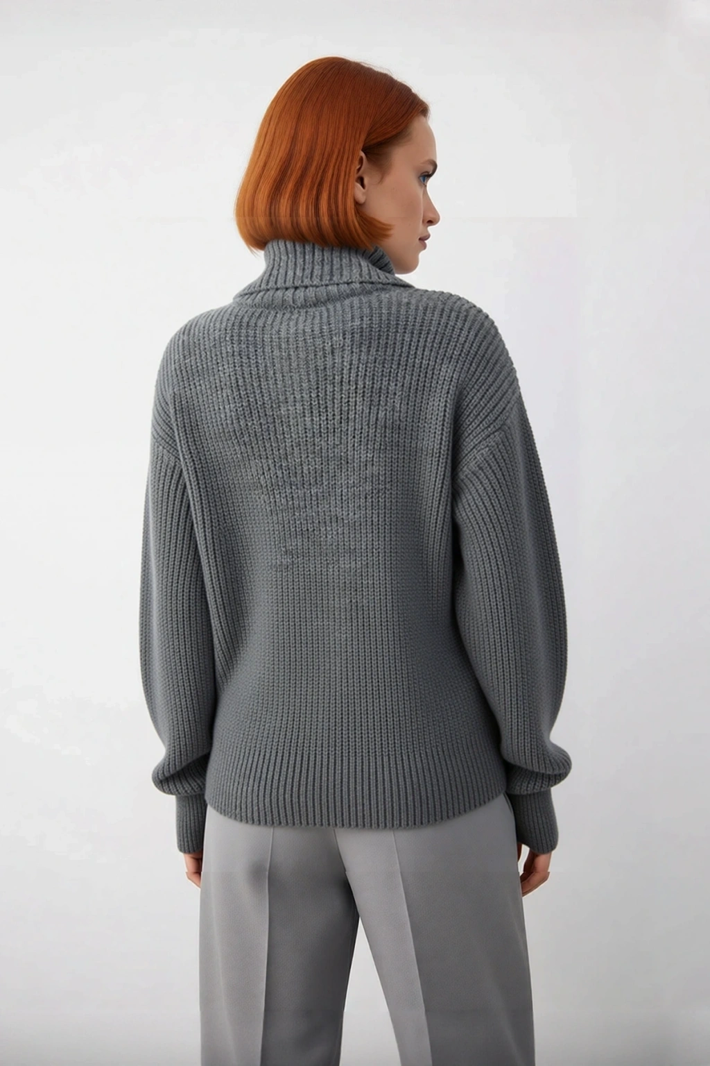 Ürün Özellikleri: Regular kalıp, akrilik polyester poliamid materyal, düz desen, fermuarlı dik yaka, düşük kol, triko kumaş, gri renk.