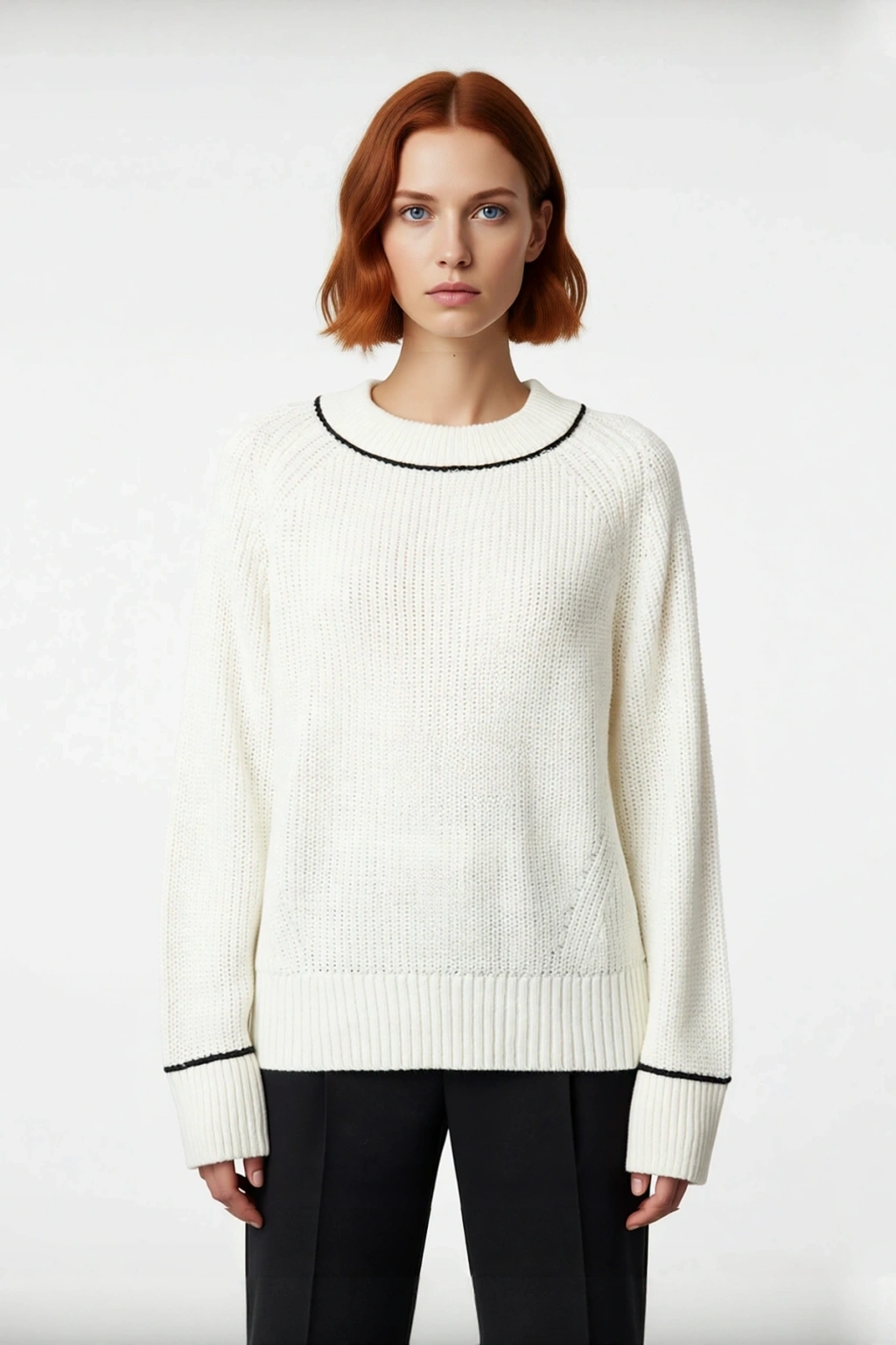 Bu Kadın Casual Selanik Örgü Triko Kazak, geniş ve modern kalıbı ile kış modasının vazgeçilmez parçalarından biri olmaya aday. Yüksek kaliteli %100 akrilik materyali sayesinde soğuk havalarda üstün bir sıcaklık ve konfor sağlarken, yumuşak dokusuyla gün boyu rahat bir kullanım sunar. Ekru rengi, yaka ve kol manşetlerindeki dikkat çekici siyah biye detaylarıyla şık bir kontrast oluşturarak stilinize modern bir dokunuş katar. Baskısız tasarımı, sadeliği ve zarafeti bir arada arayan kadınlar için ideal bir seçimdir.