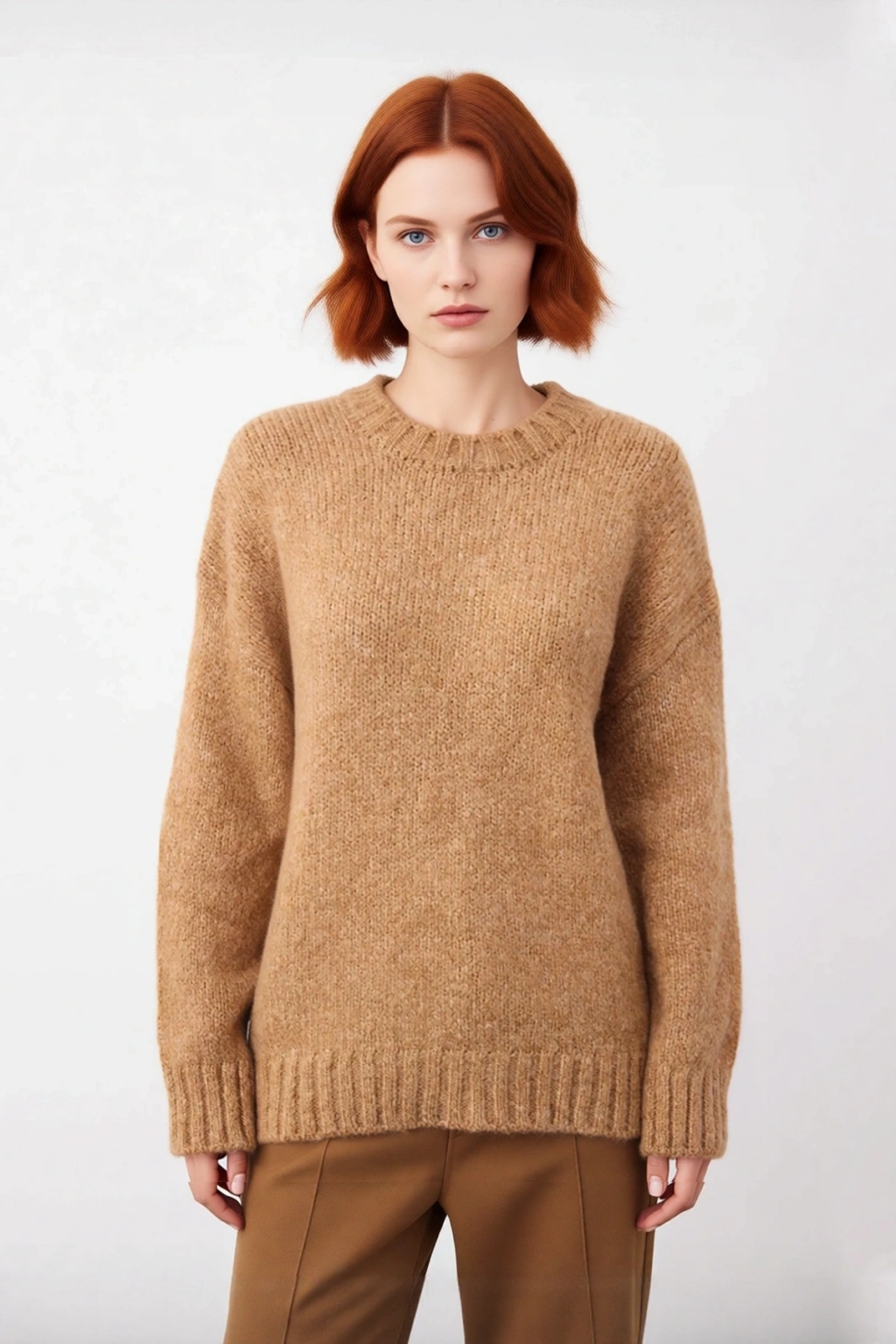 Ürün Özellikleri: Oversize kalıp, akrilik poliamid materyal, düz desen, bisiklet yaka, düşük kol, triko kumaş, kahverengi renk, tek plaka dokuma.